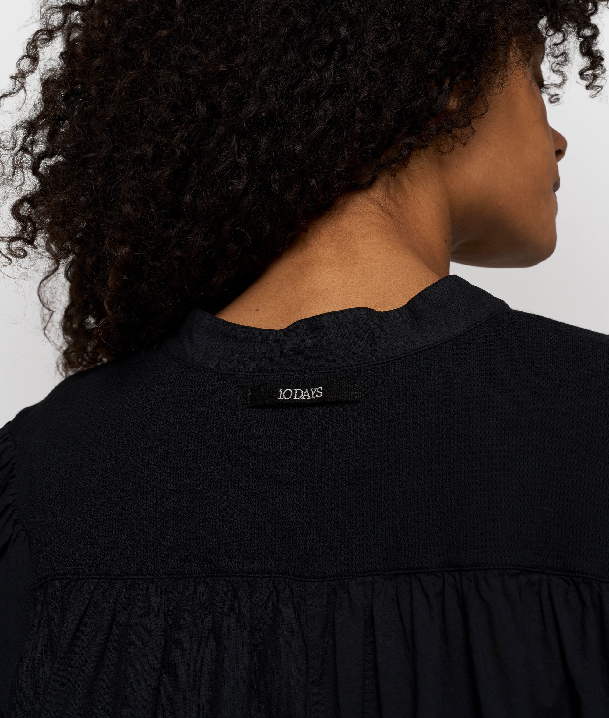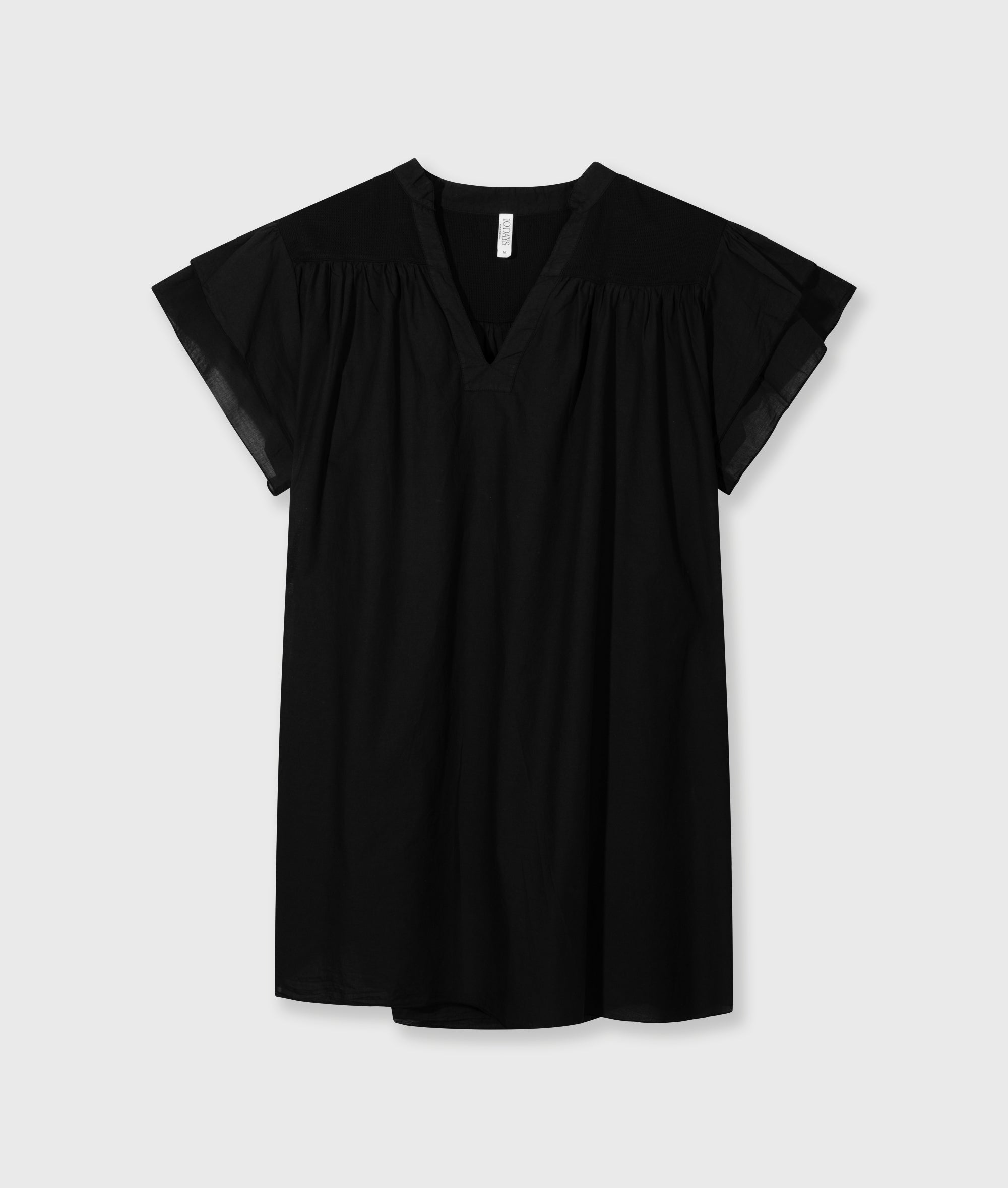 Oversized fit A-lijn jurk met ruffle mouwen, gemaakt van katoenen voile met een inzet van square mesh. Voorzien van een dubbele mesh yoke aan de voor- en achterzijde, subtiele plooien op de voor- en achterzijde, dubbele ruffles langs de armsgaten, een klein ‘10DAYS’ label op de achterkant bij de nek en een klein label in de zijnaad.