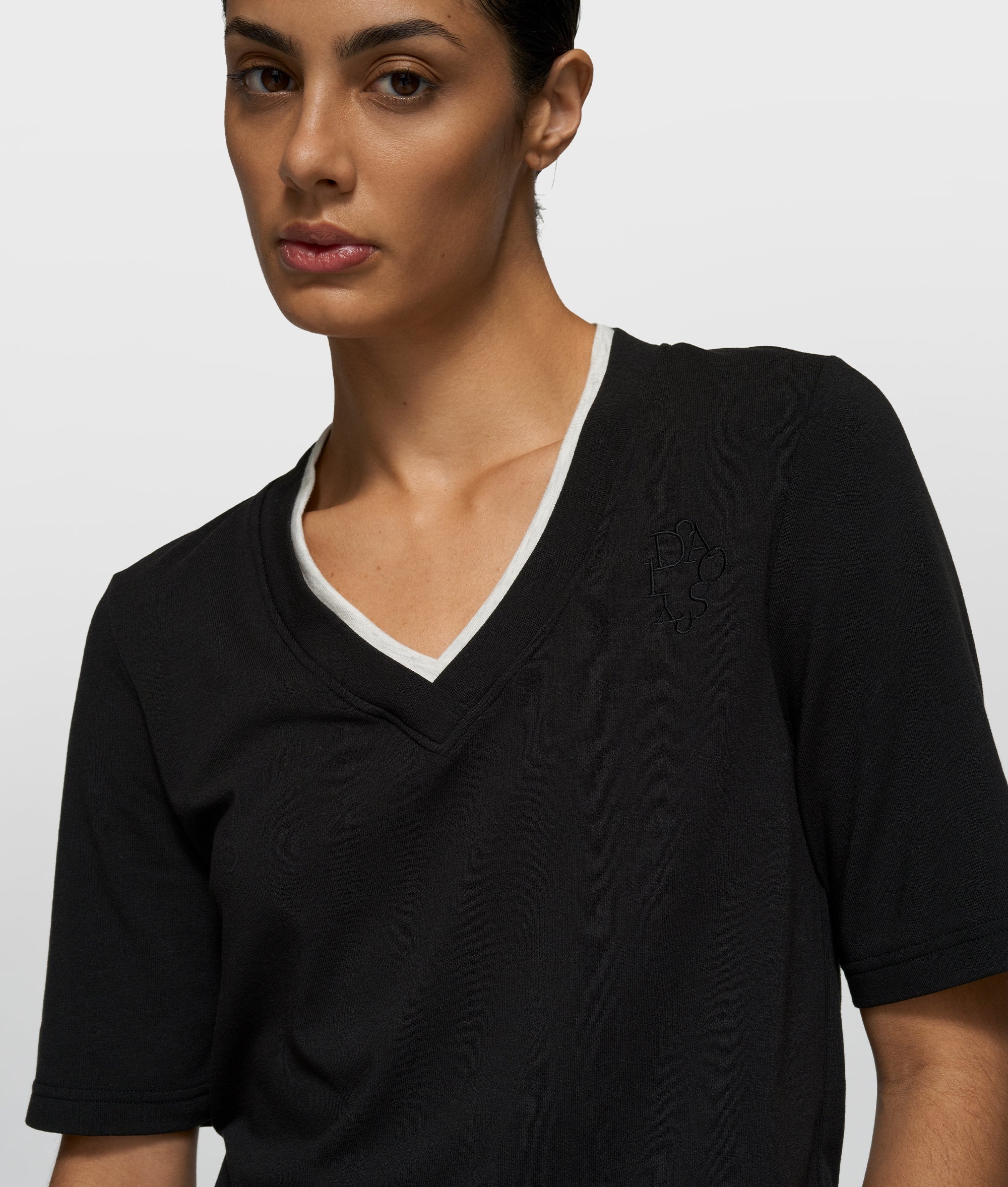 Slim fit T-shirt met korte mouwen, gemaakt van zacht modal jersey. Voorzien van een V-hals en zoom met dubbele laag en een 'curly 10' borduring op de linkerborst.