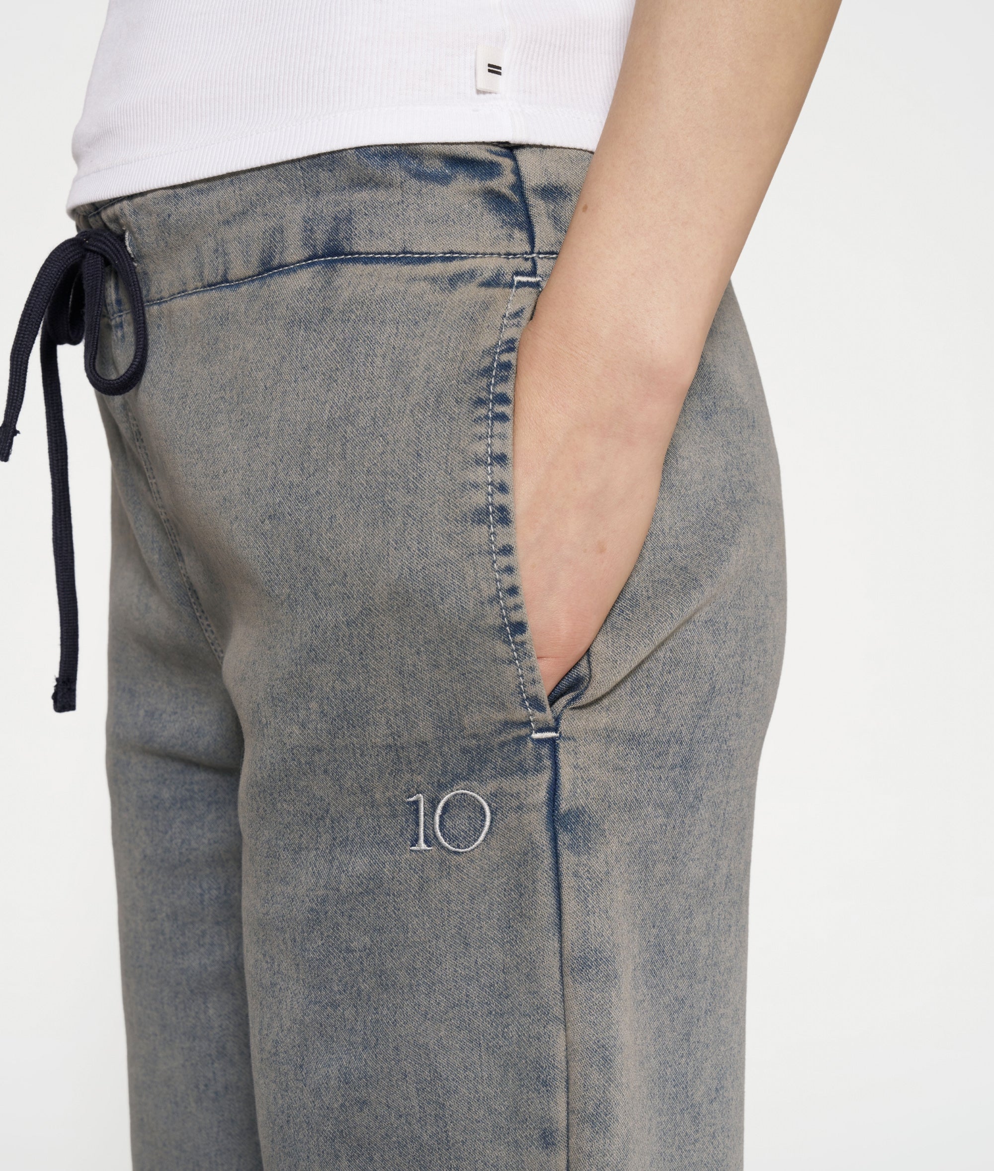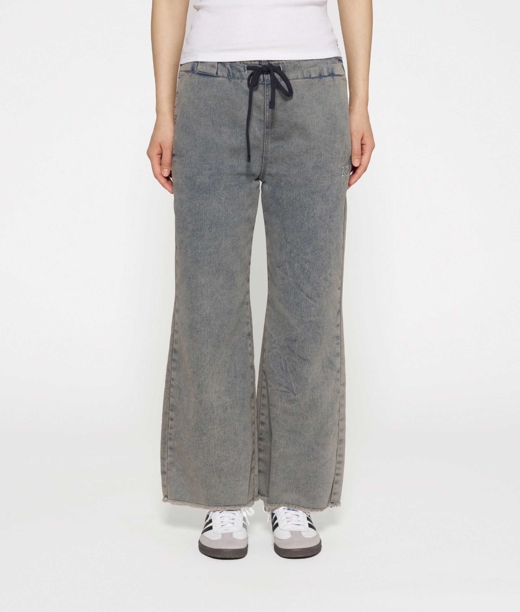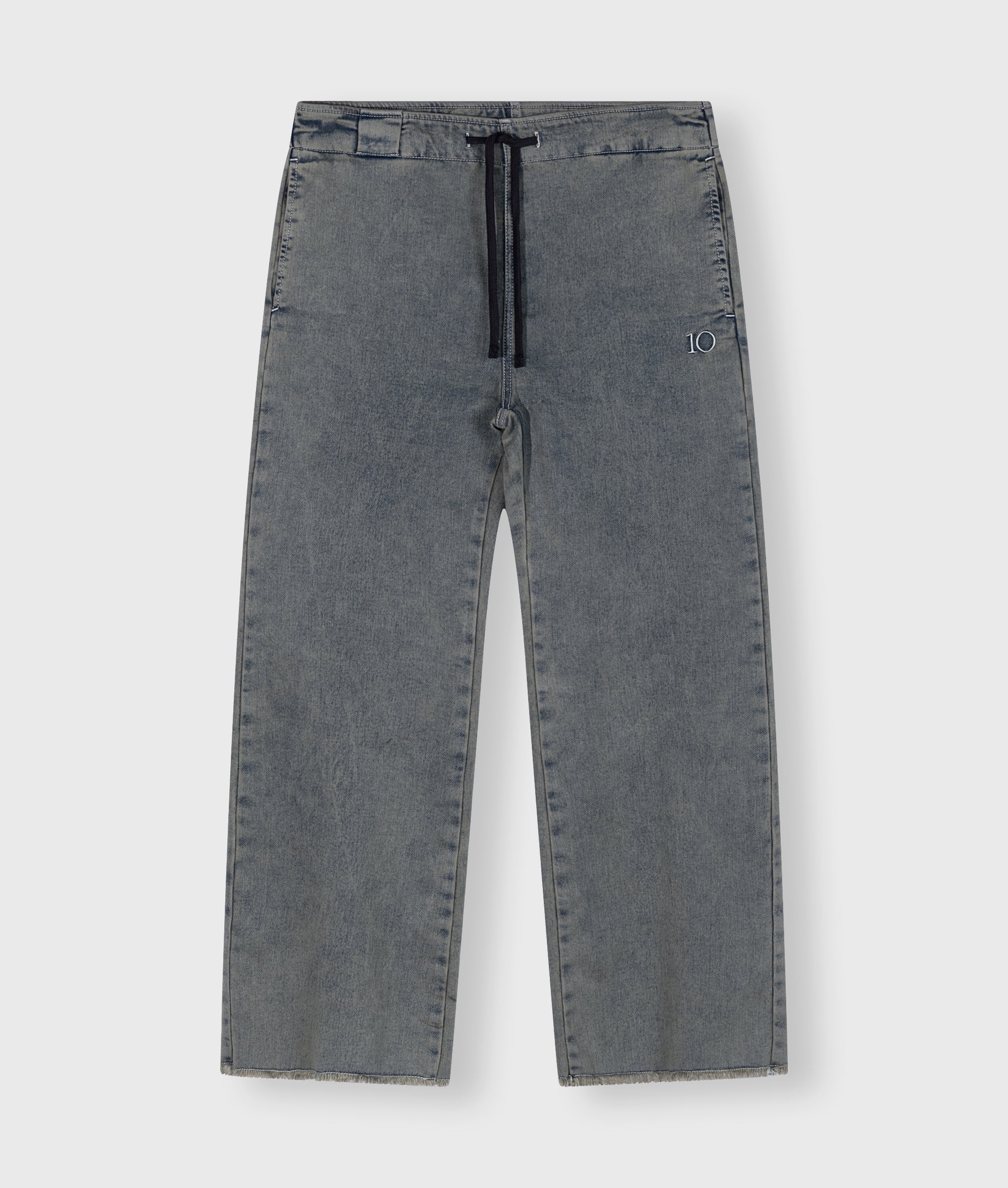 Relaxed fit flared jogger, gemaakt van een katoenblend jog denim. Voorzien van een elastische tailleband met trekkoord, een riemlus, steekzakken, een opgestikte achterzak, raw edge broekspijpen en '10' logo borduring onder de linker steekzak.