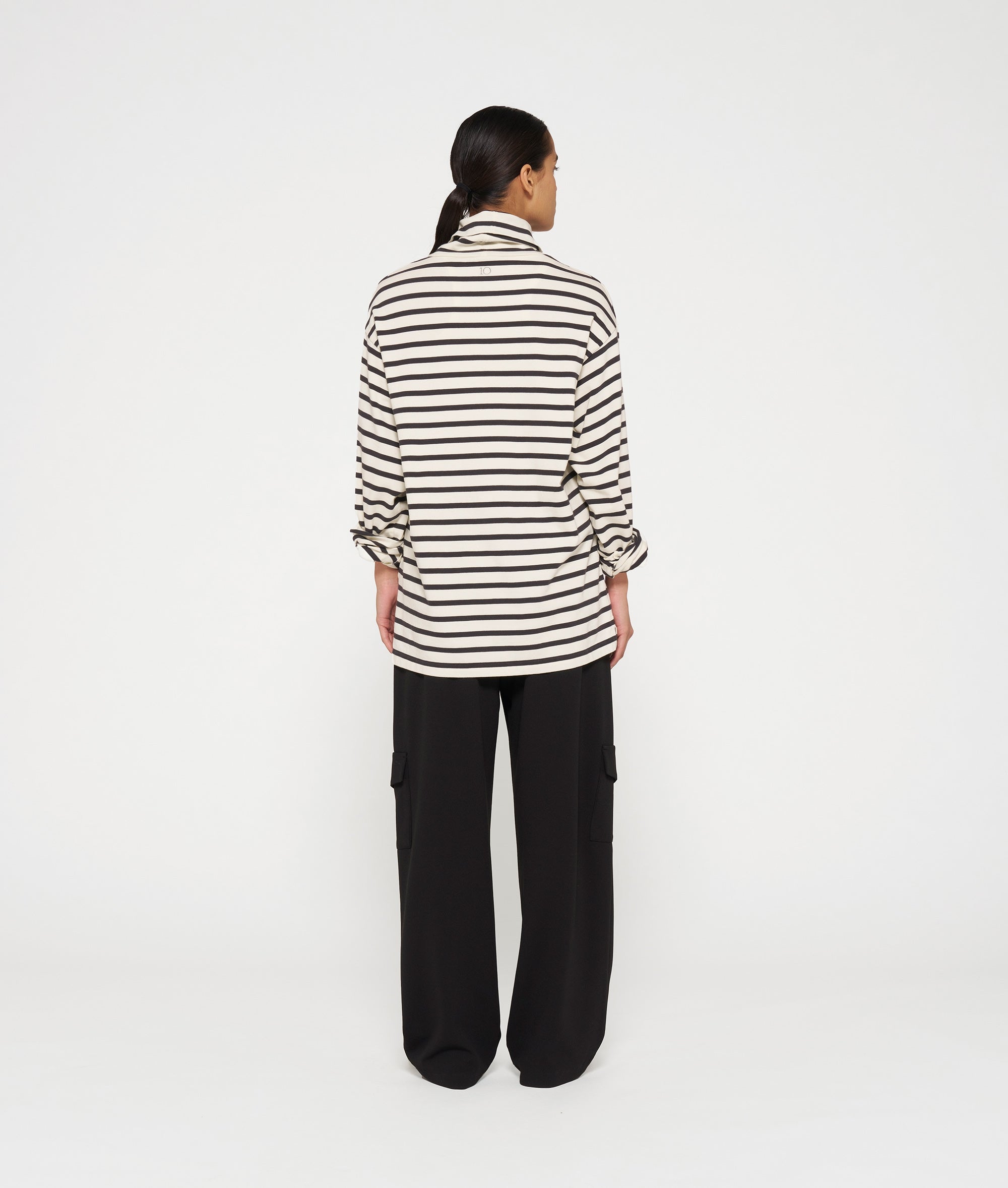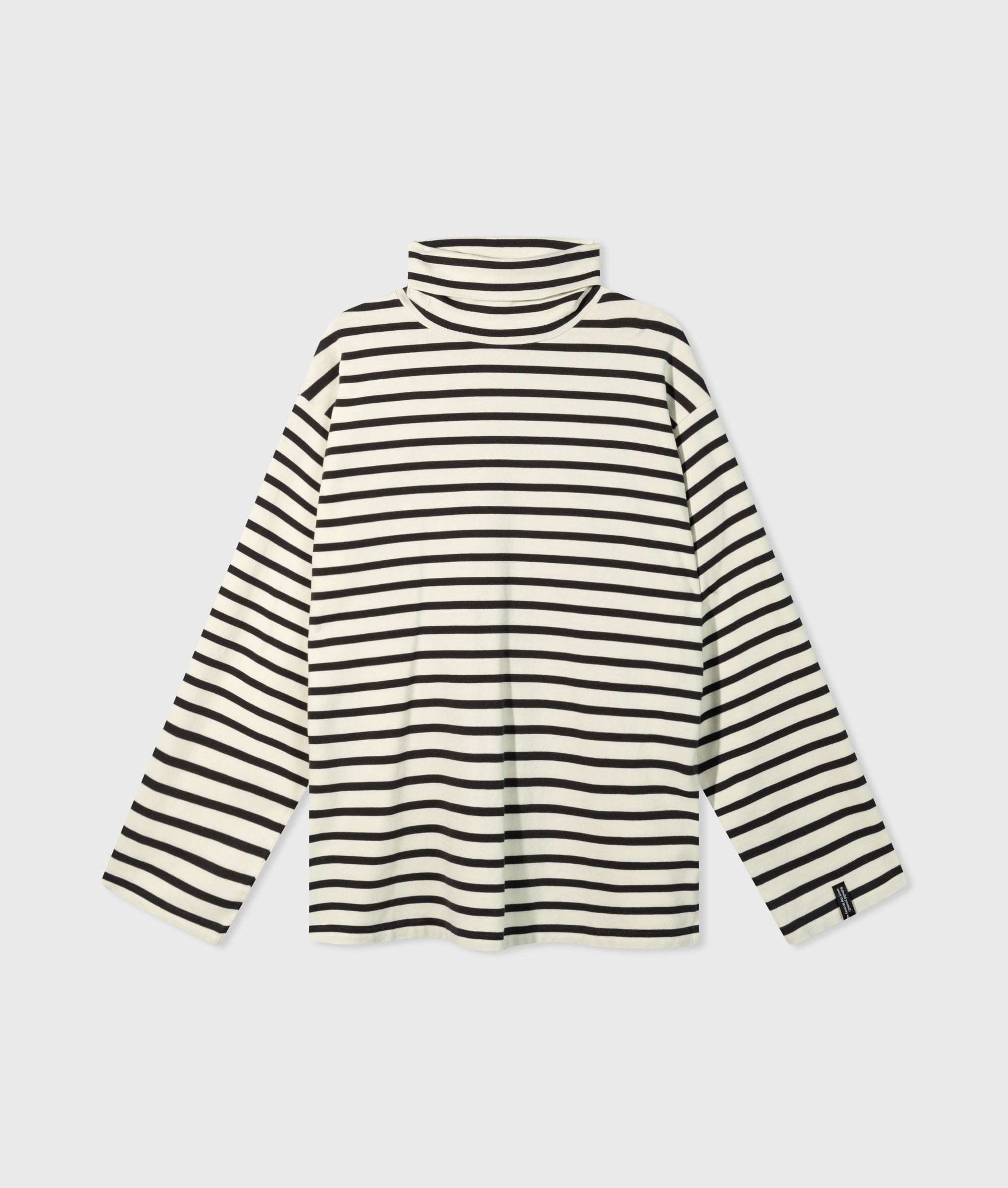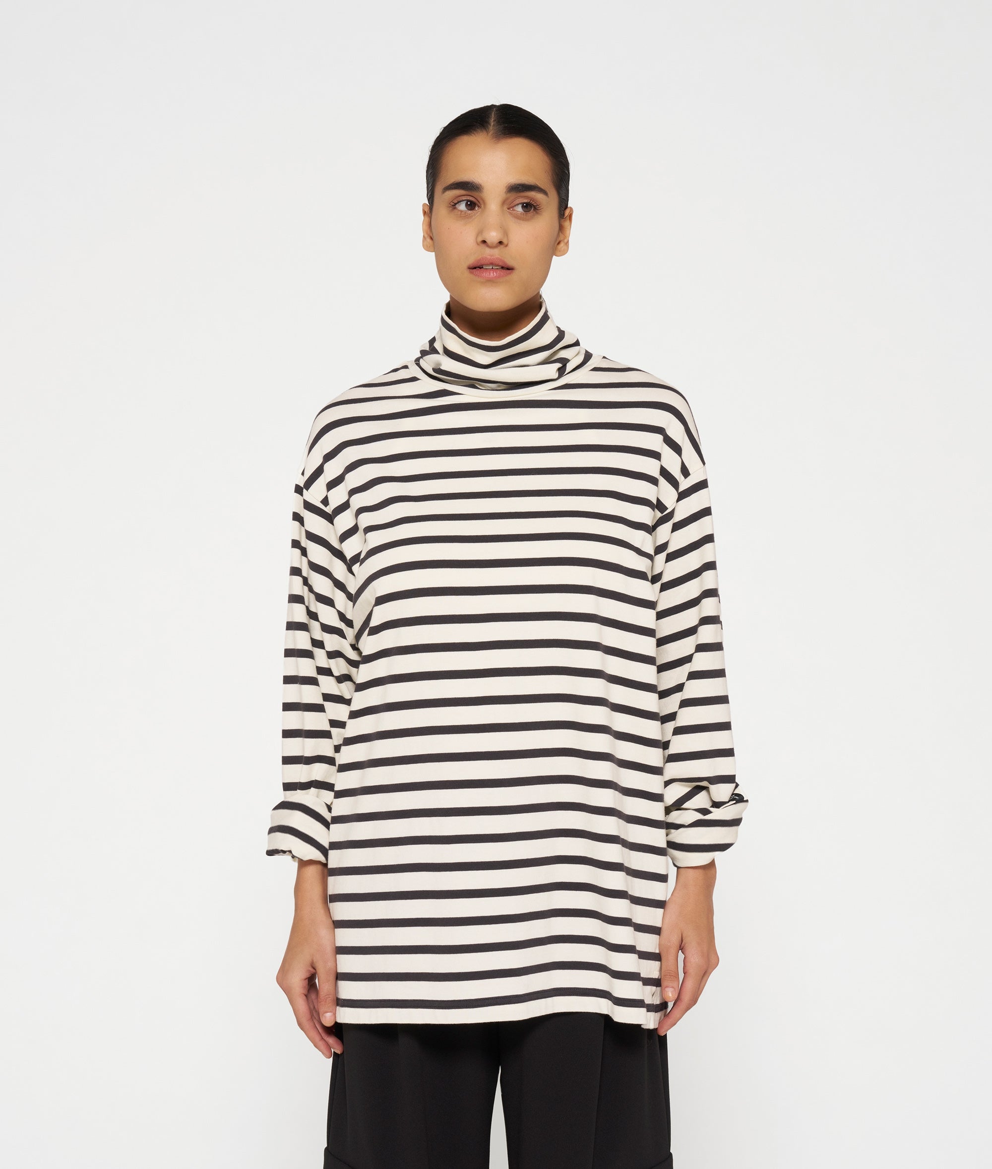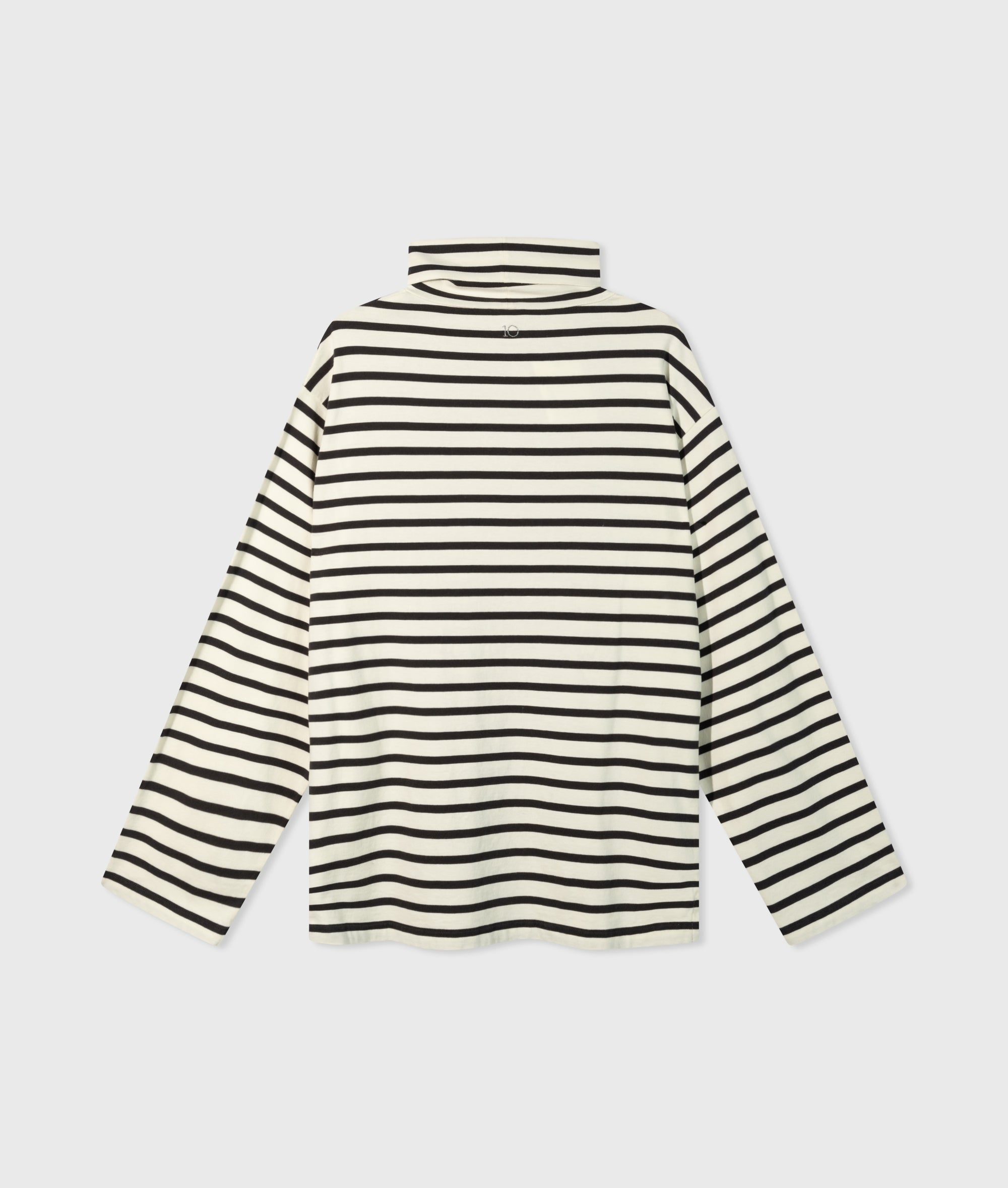 Relaxed fit gestreepe long sleeve top met col, gemaakt van dikke, GOTS gecertificeerd biologisch katoenen jersey. Voorzien van een hoge omgeslagen hals, kleine zijsplitten, een lage mouwinzet, een label onderaan de linkermouw en een '10' monogram borduring op de rug.