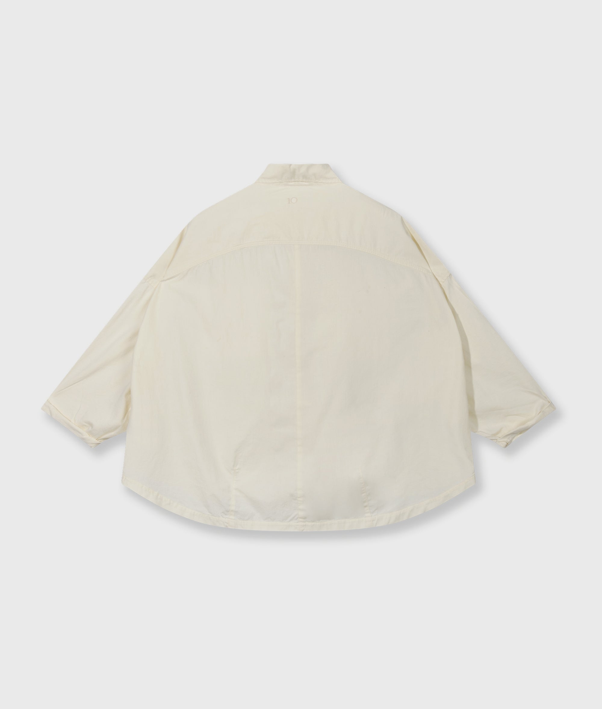 Oversized fit blouse met katoenen poplin body en katoenen jersey mouwen, gemaakt van GOTS-gecertificeerd biologisch katoen. Voorzien van een klassieke kraag, knoopsluiting, een ronde zoom die achter langer is dan voor, borstzakken, raw-edge opgerolde mouwen en een ‘10’ monogram borduring op de rug.
