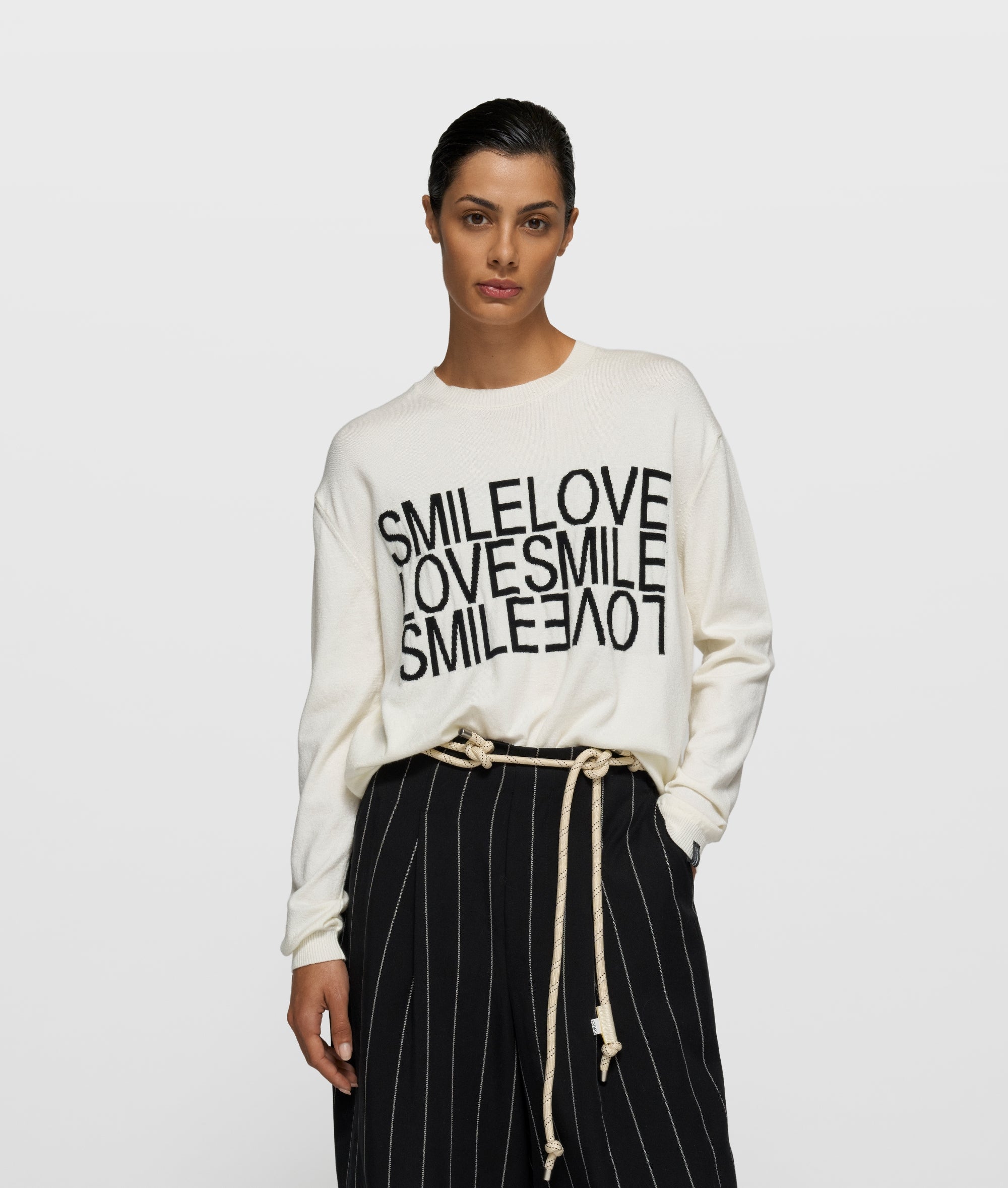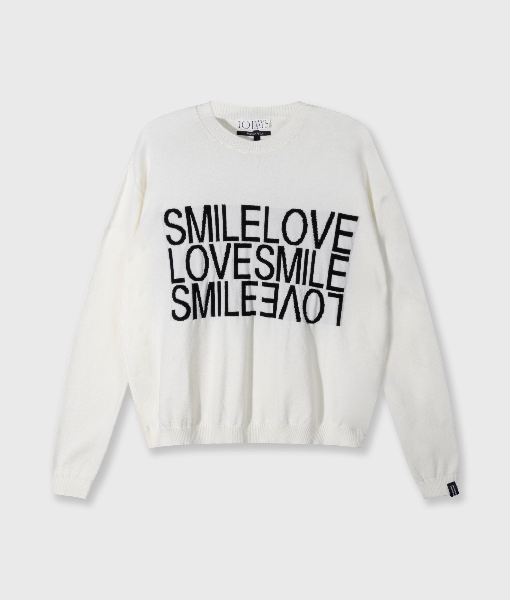 Regular fit gebreide sweater, gemaakt van zacht tech knit. Voorzien van ribgebreide boorden, een ronde hals, een tagline-label aan de mouw en een ingeweven ‘SMILE LOVE 10DAYS square’ op de voorkant.