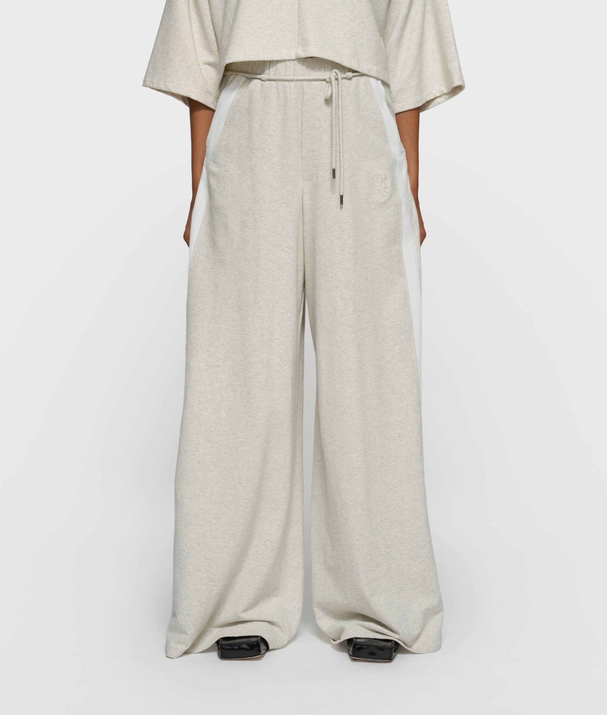 Relaxed fit jogger met wijde pijpen, gemaakt van GOTS-gecertificeerd biologisch katoenen babyfleece. Voorzien van een elastische tailleband met trekkoord, steekzakken, tapestroken langs de zijnaden, een nepachterzak en een ‘curly 10’ borduring onder de linker voorzak.