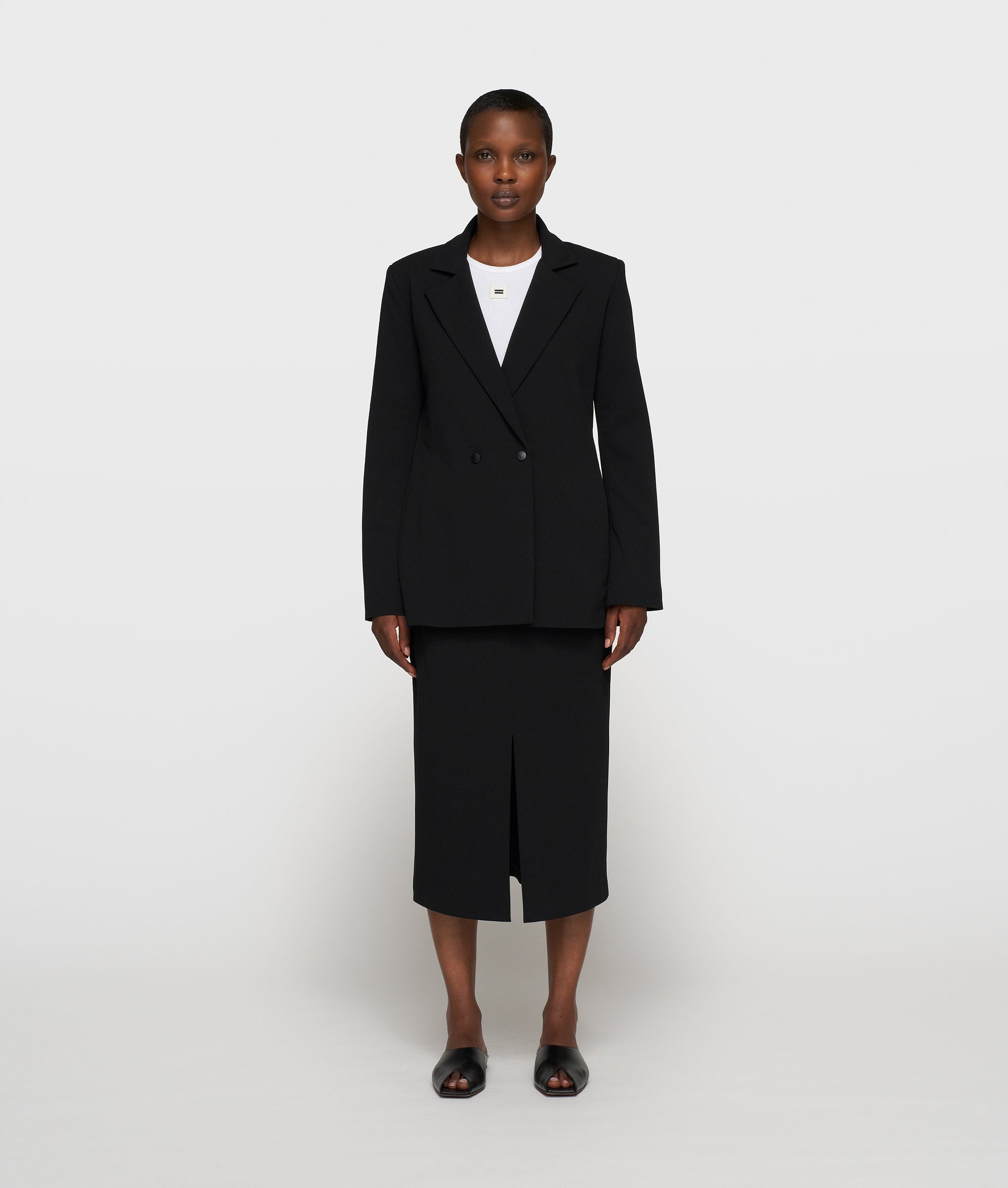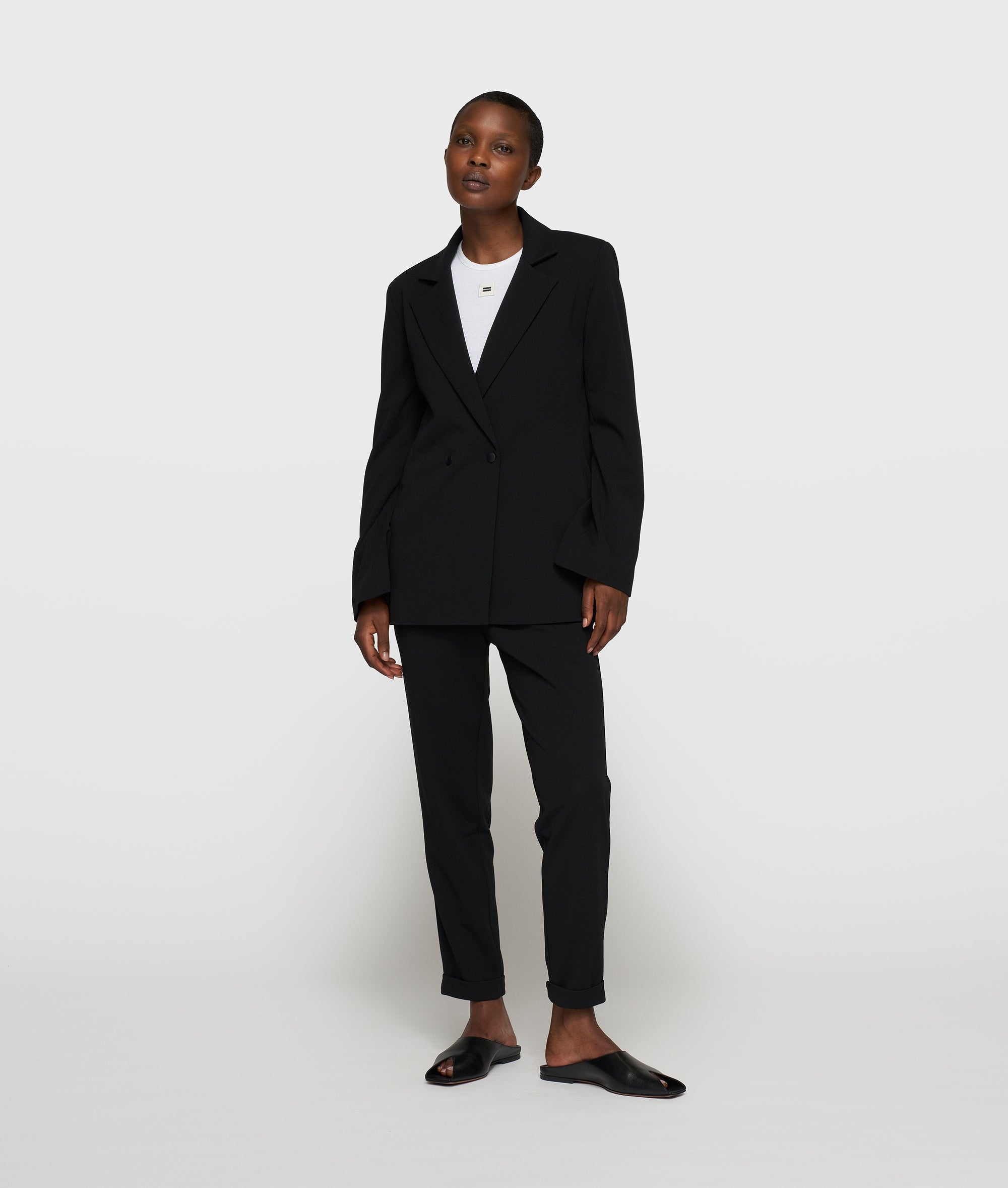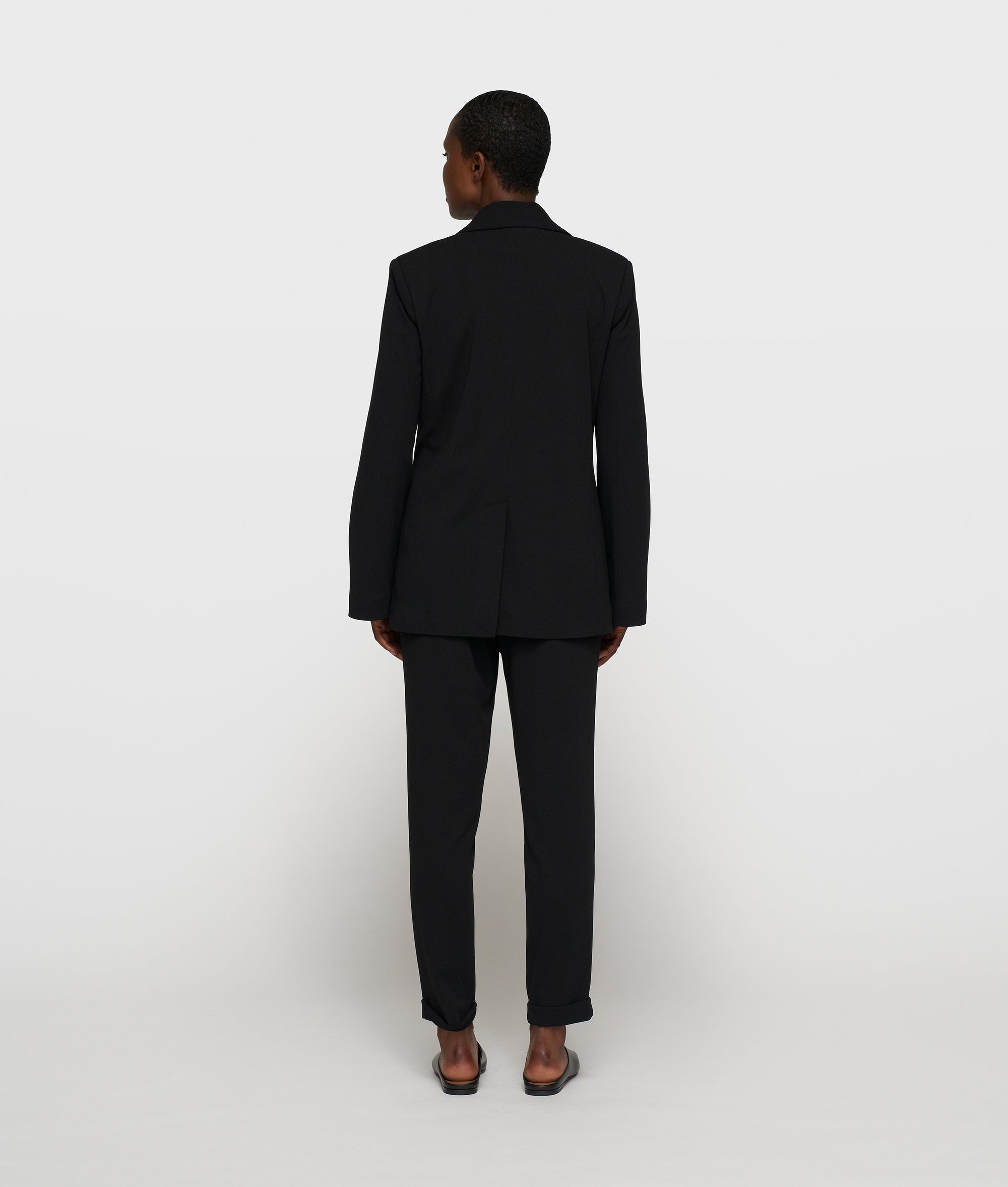 Deze regular fit double-breasted blazer is gemaakt van lichte zwarte crêpe stretchkwaliteit en draagt comfortabel de hele dag. De klassieke reverskraag en subtiele schoudervulling geven een krachtige, gepolijste vorm. Matte drukknoopjes, steekzakken, 'costume comfort' borduring bij de kraag en een split aan de achterzijde zorgen voor functionaliteit en bewegingsvrijheid en maakt dit een tijdloos werkitem.