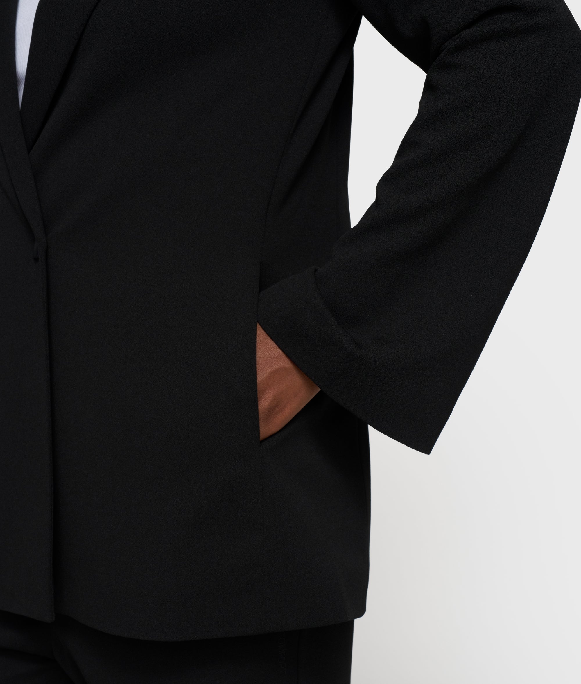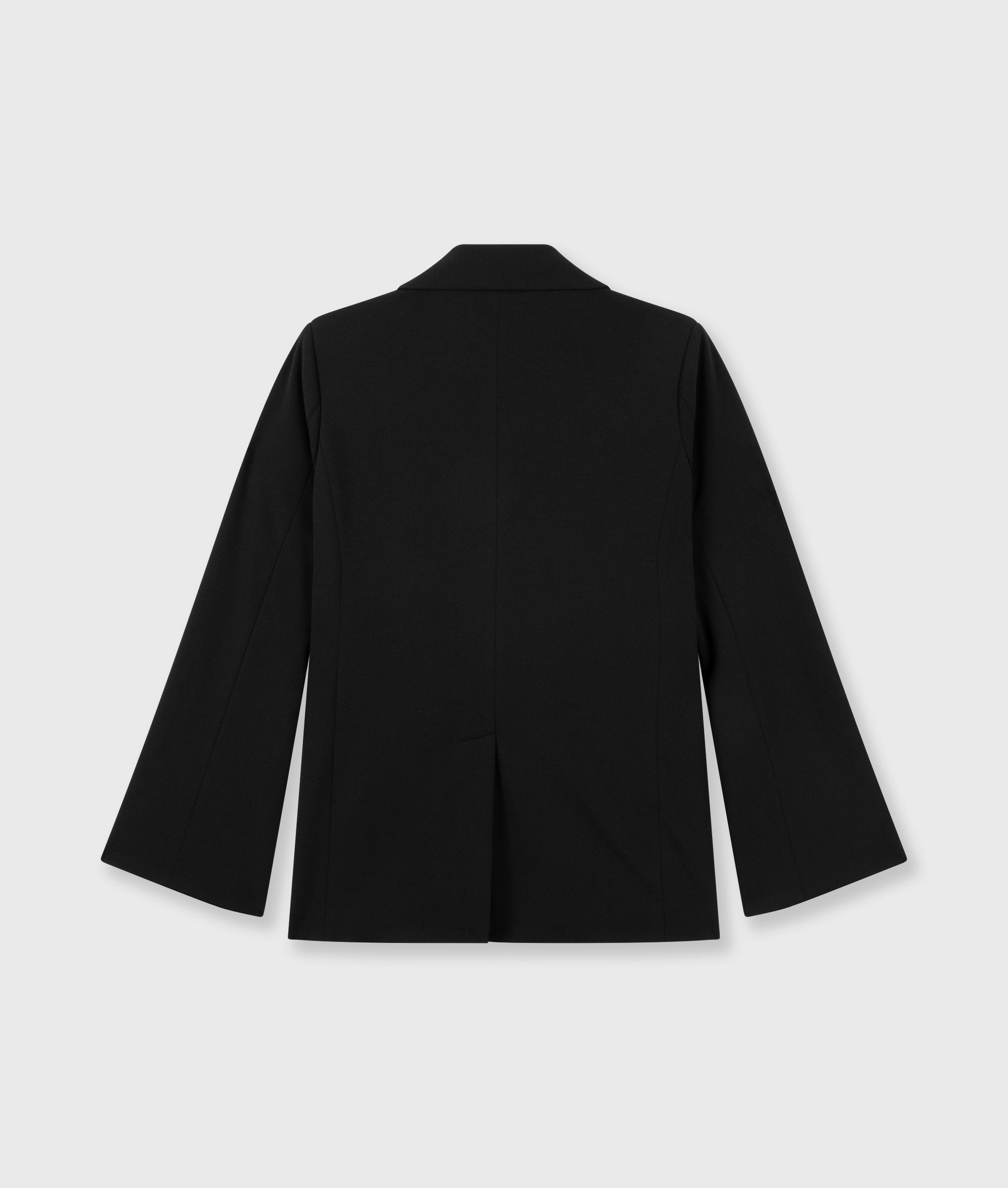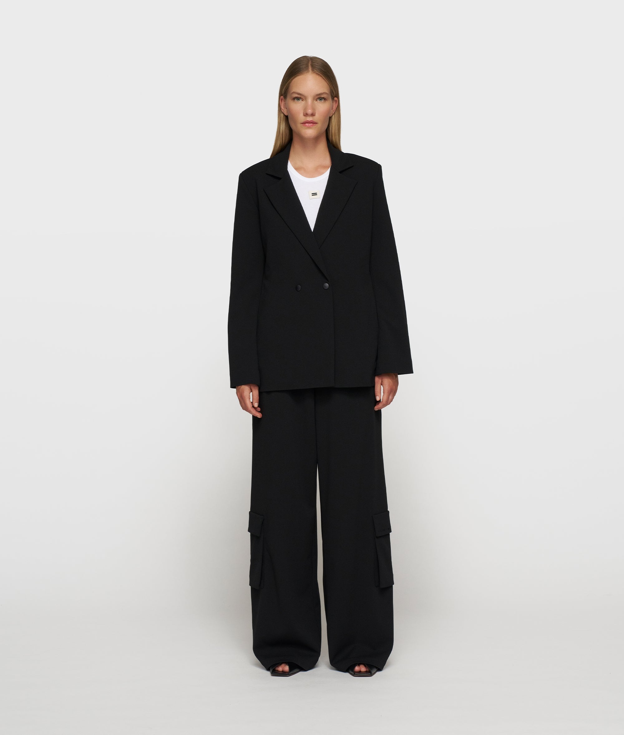 Deze regular fit double-breasted blazer is gemaakt van lichte zwarte crêpe stretchkwaliteit en draagt comfortabel de hele dag. De klassieke reverskraag en subtiele schoudervulling geven een krachtige, gepolijste vorm. Matte drukknoopjes, steekzakken, 'costume comfort' borduring bij de kraag en een split aan de achterzijde zorgen voor functionaliteit en bewegingsvrijheid en maakt dit een tijdloos werkitem.