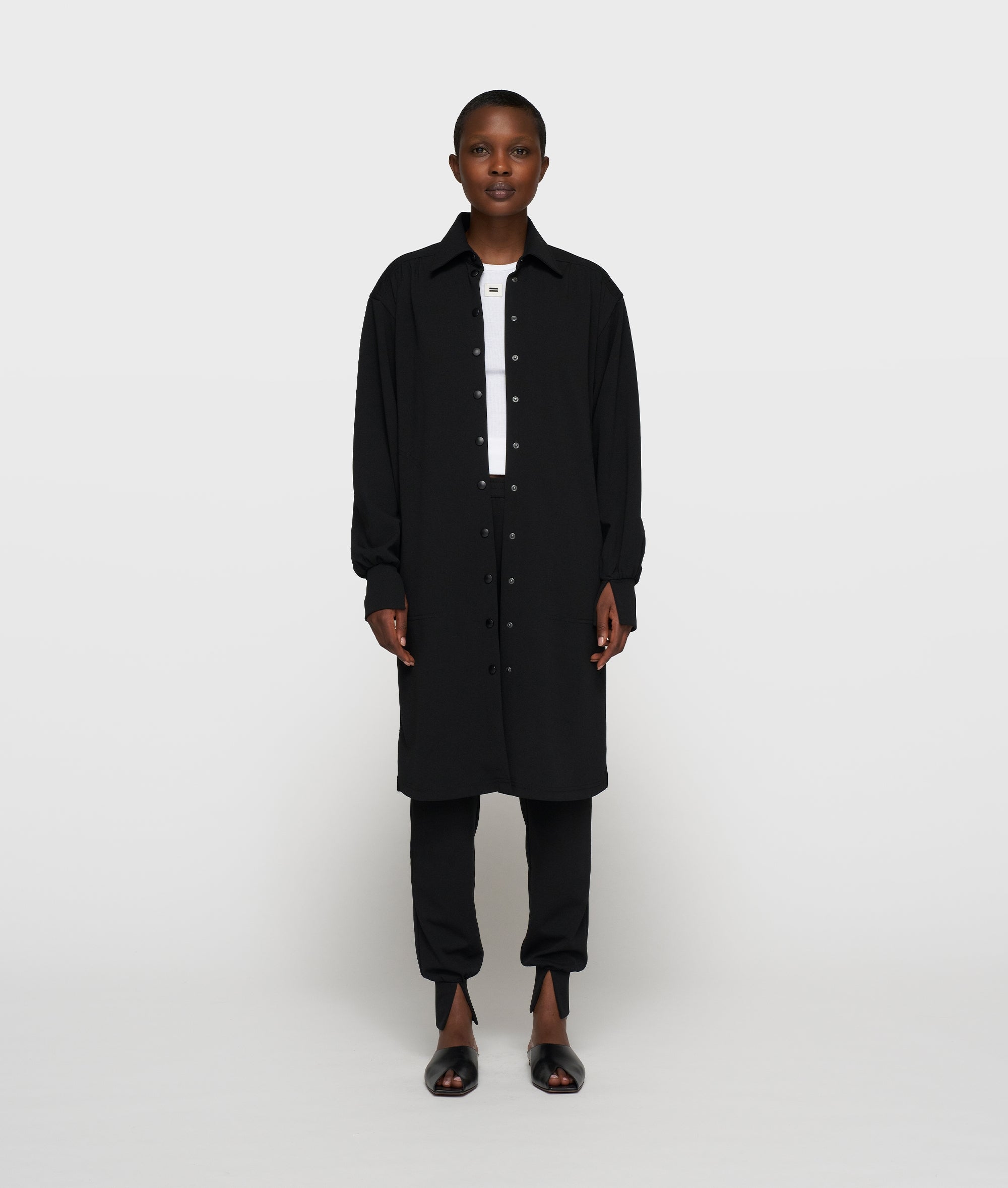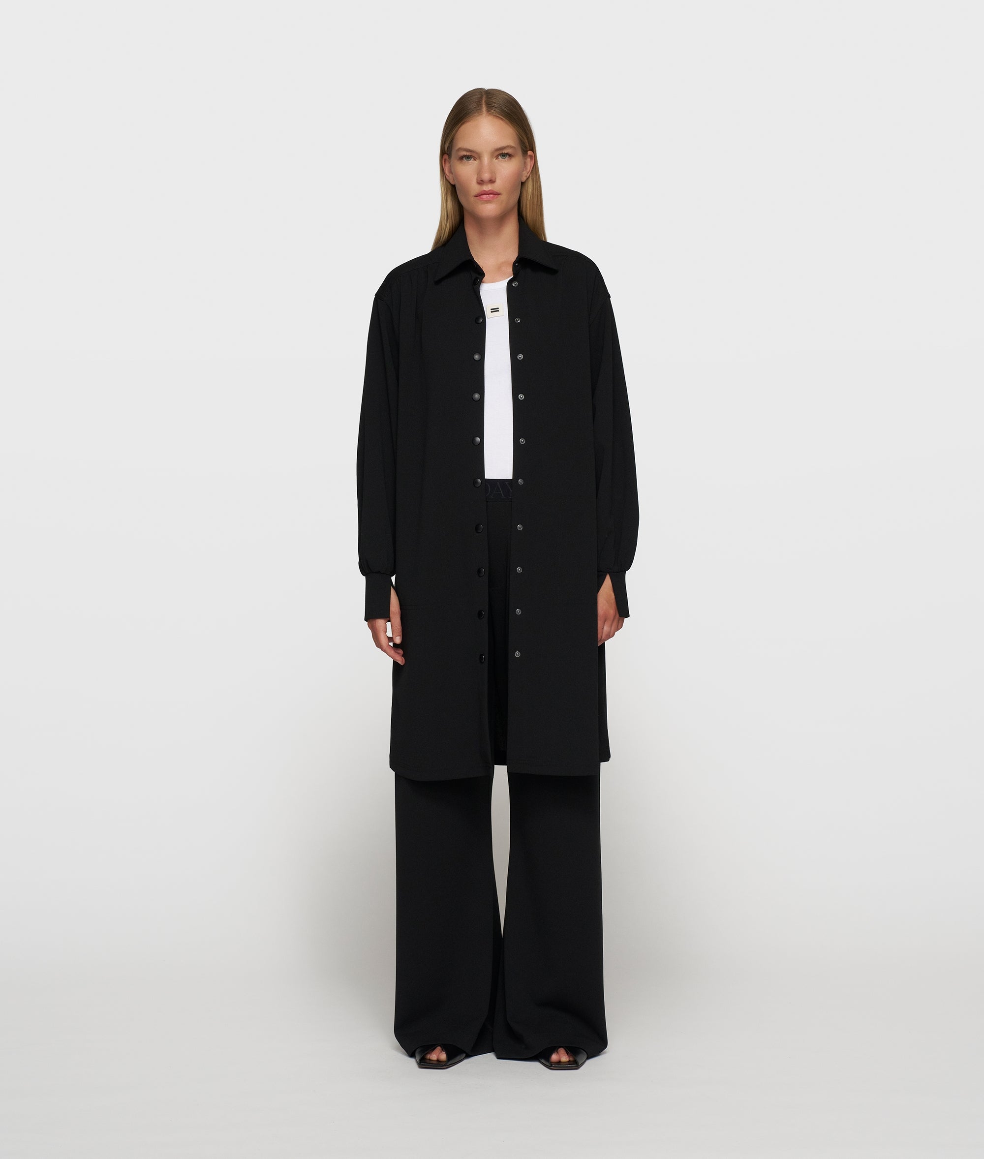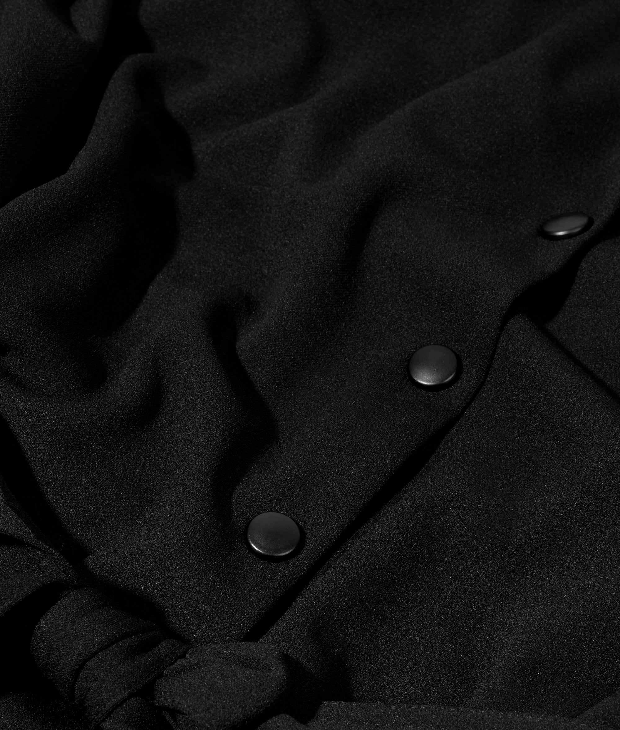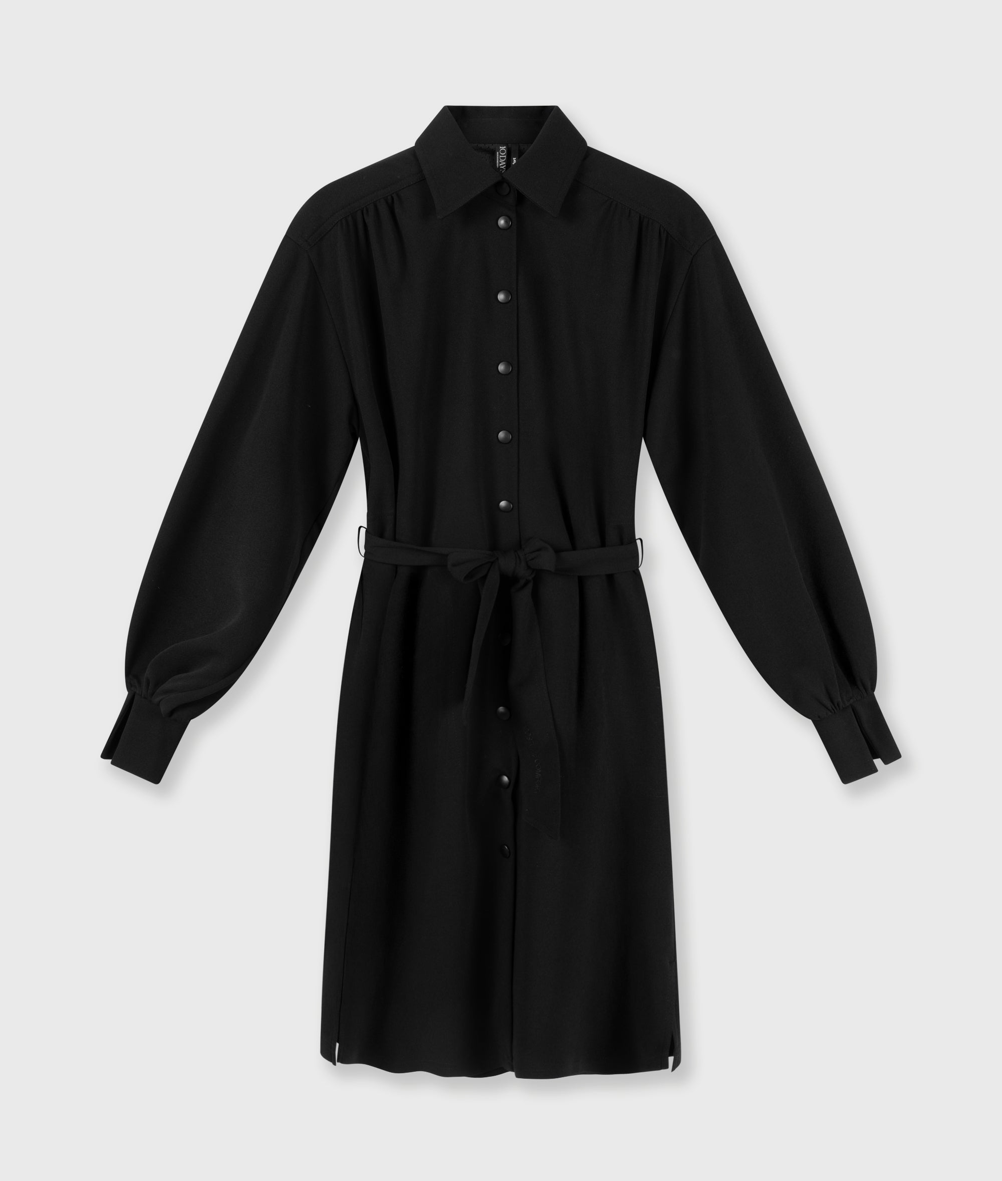 Deze relaxed fit tuniekjurk is gemaakt van lichte zwarte crêpe stretchkwaliteit en voelt comfortabel aan gedurende de hele dag. De doorknoopsluiting met matte drukknoopjes en de klassieke kraag zorgen voor een verfijnde uitstraling. Het ceintuur met 'costume comfort' borduring geeft subtiele taille-accentuering, terwijl de afgeronde zoom met zijsplitten een ontspannen lijn creëert. Ideaal voor werk en reizen met een moderne look.