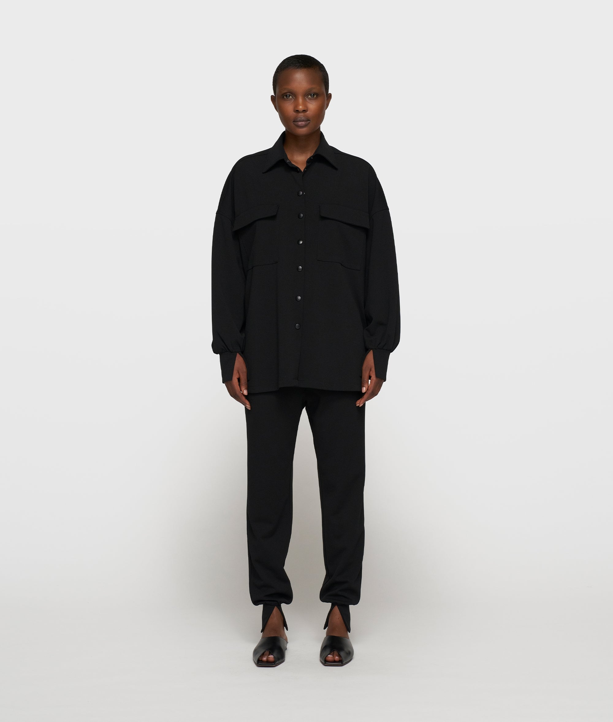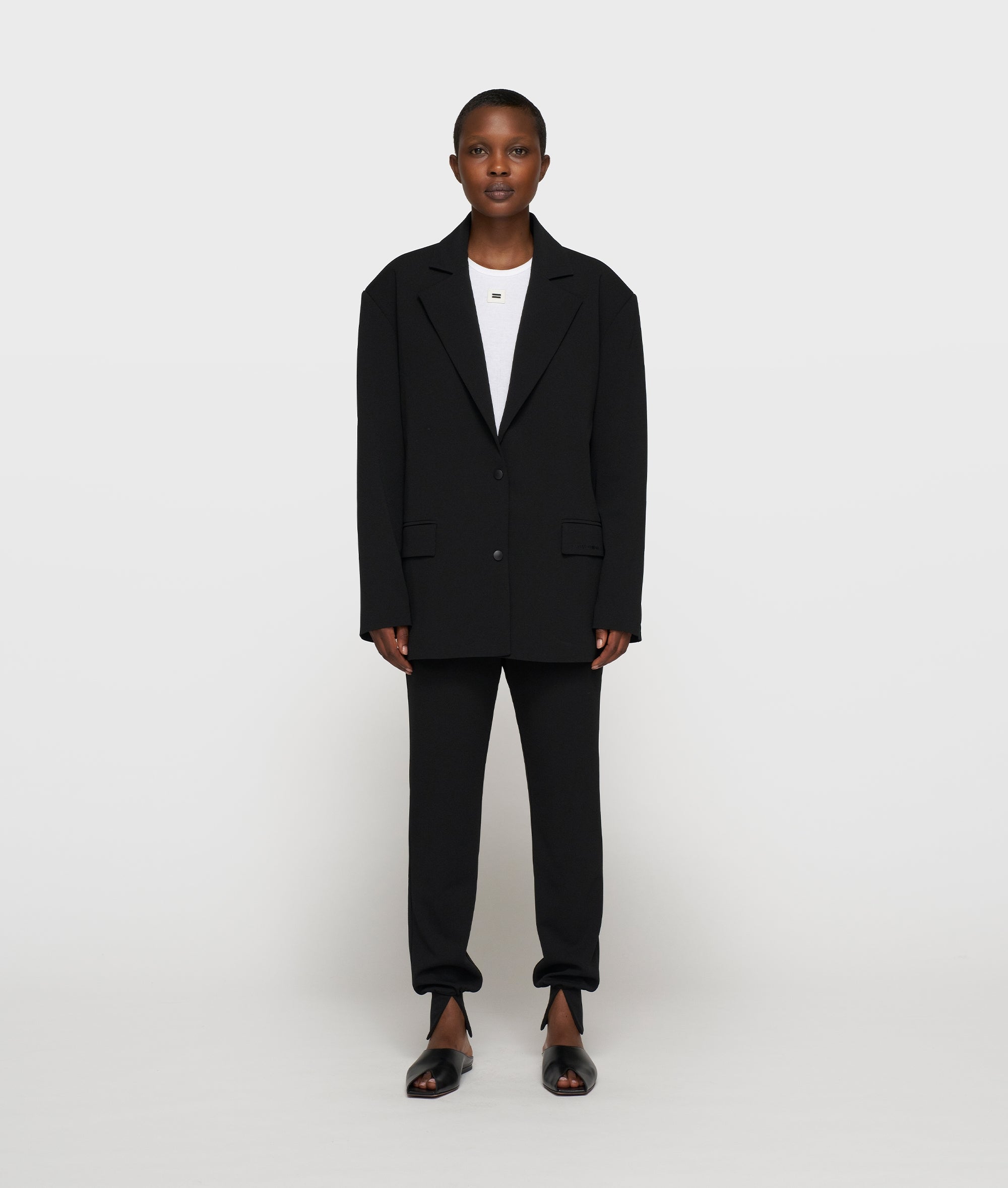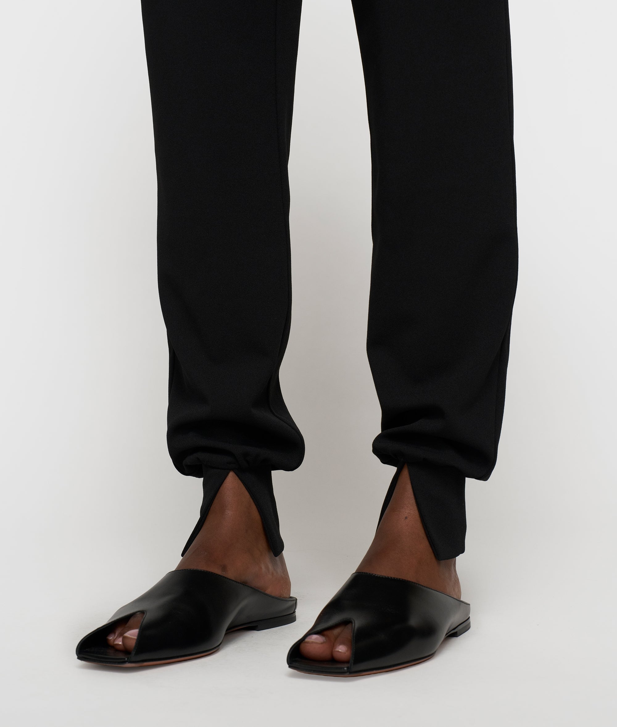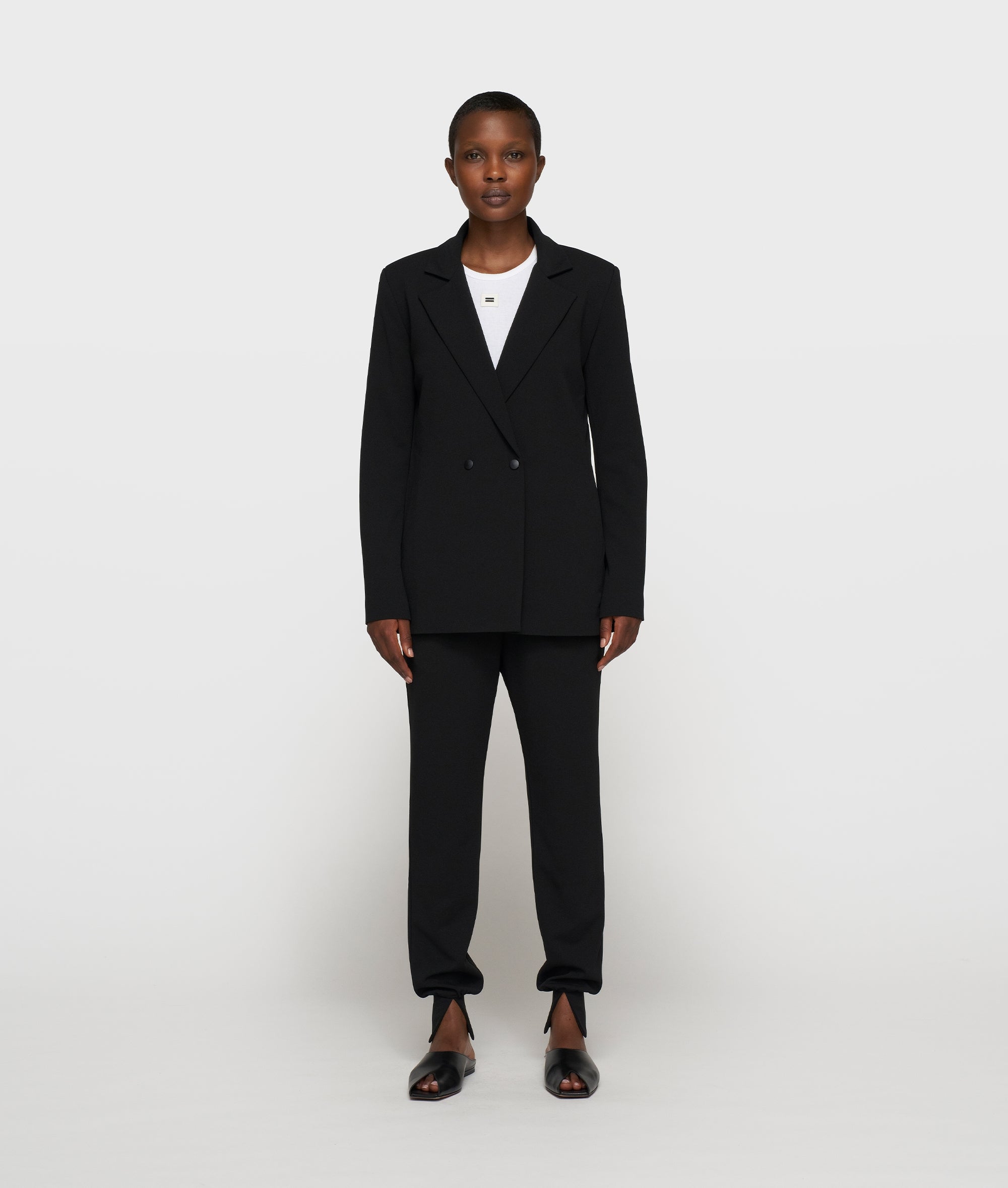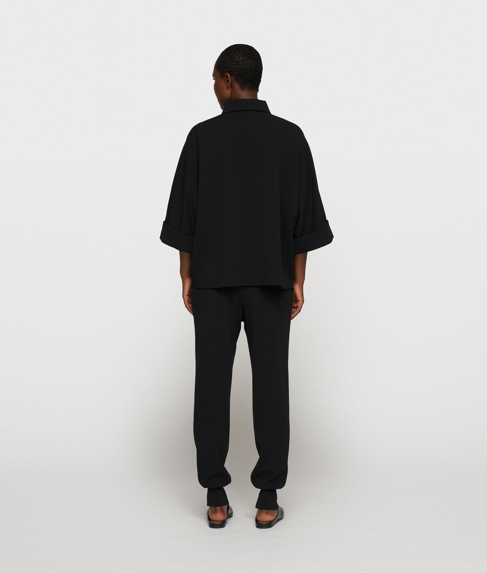 Deze relaxed fit pantalon is gemaakt van een lichte zwarte crêpe stretchkwaliteit die soepel meebeweegt en de hele dag comfortabel aanvoelt. De middelhoge taille met elastische tailleband en riemlussen zorgt voor een moeiteloze, goed aansluitende pasvorm. Praktische steekzakken, brede boorden langs de enkels en een split aan de voorzijde geven de pantalon een moderne, verfijnde uitstraling. De subtiele 'costume comfort' borduring onder de linker steekzak onderstreept de signatuur van de 10DAYS925-collectie en maakt dit item ideaal voor kantoor- en reisdagen of een cleane, effortless look.