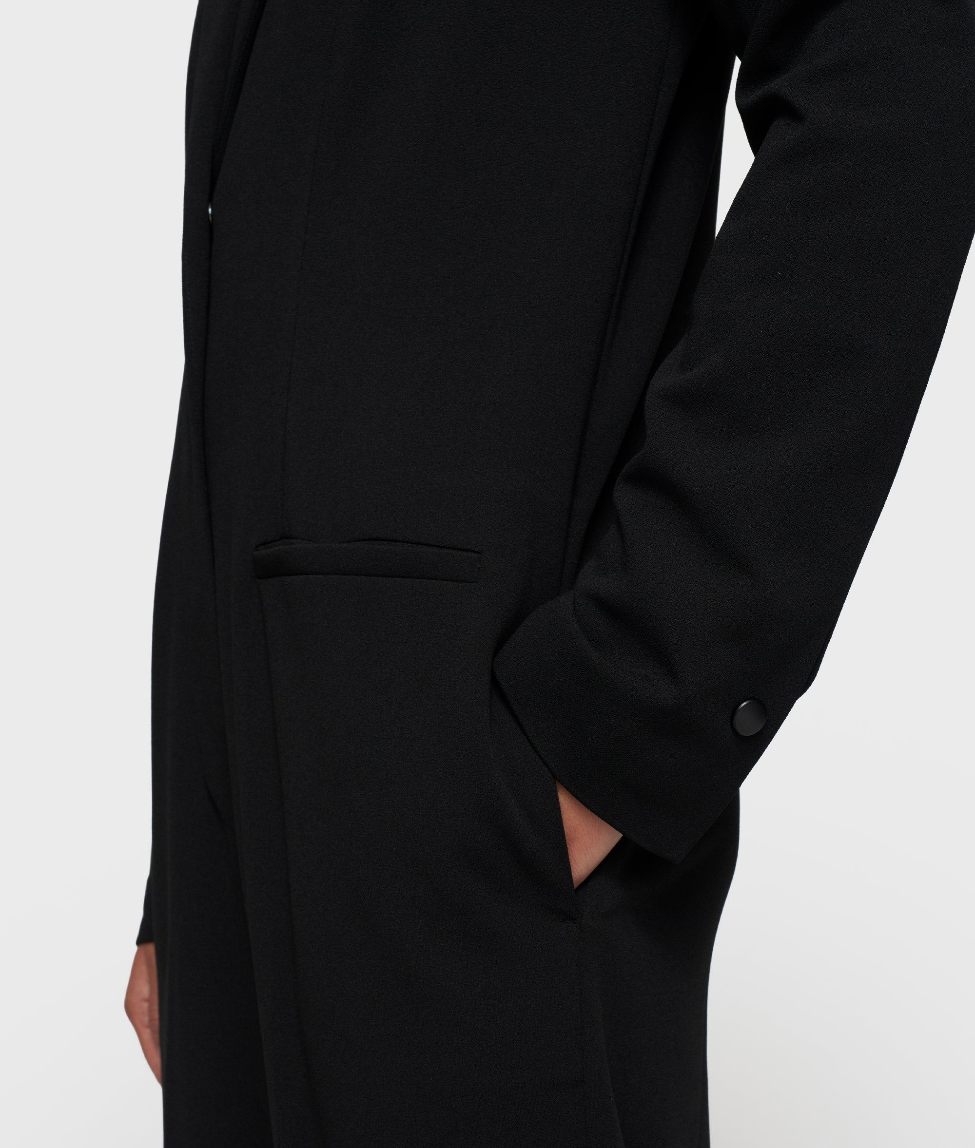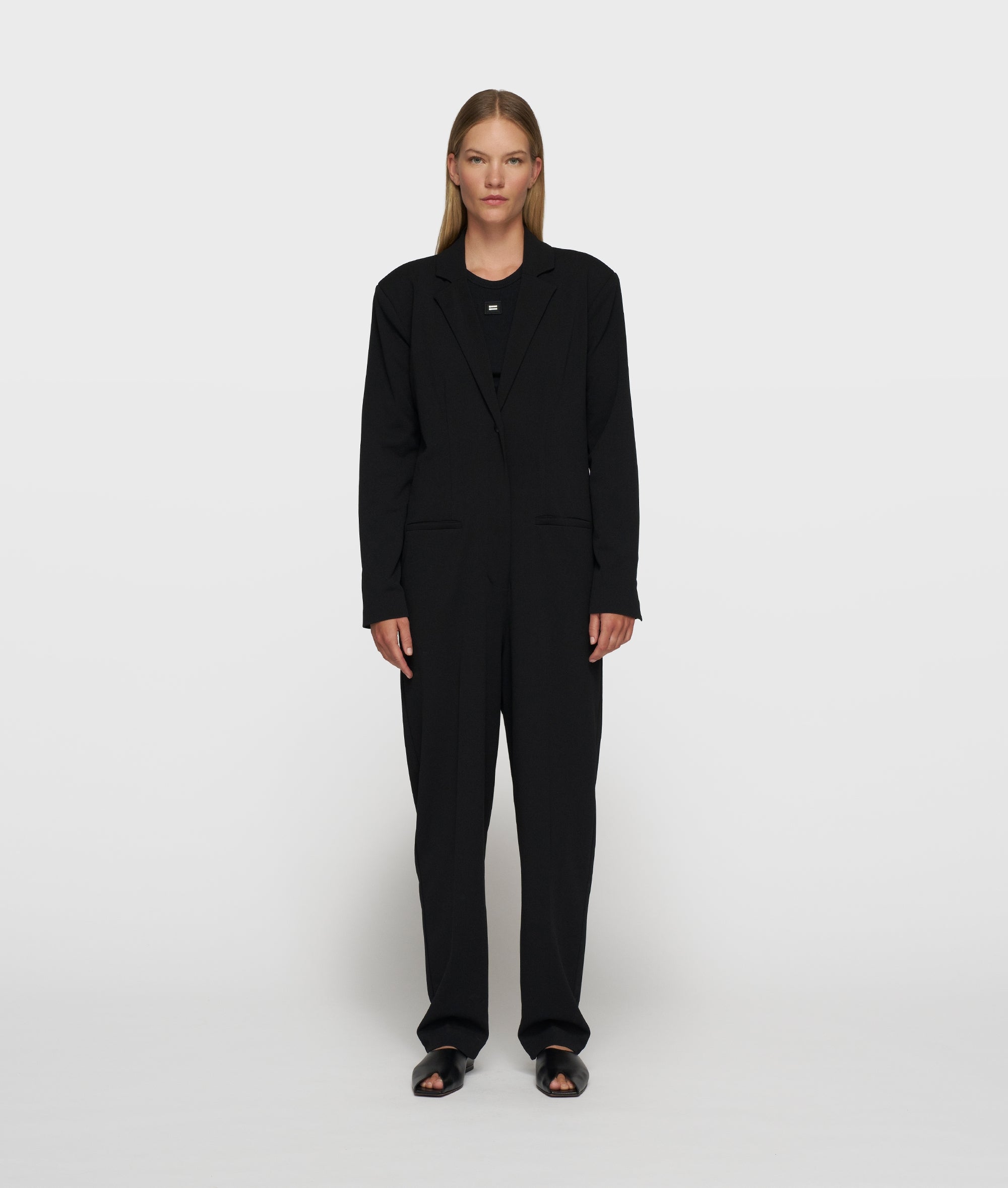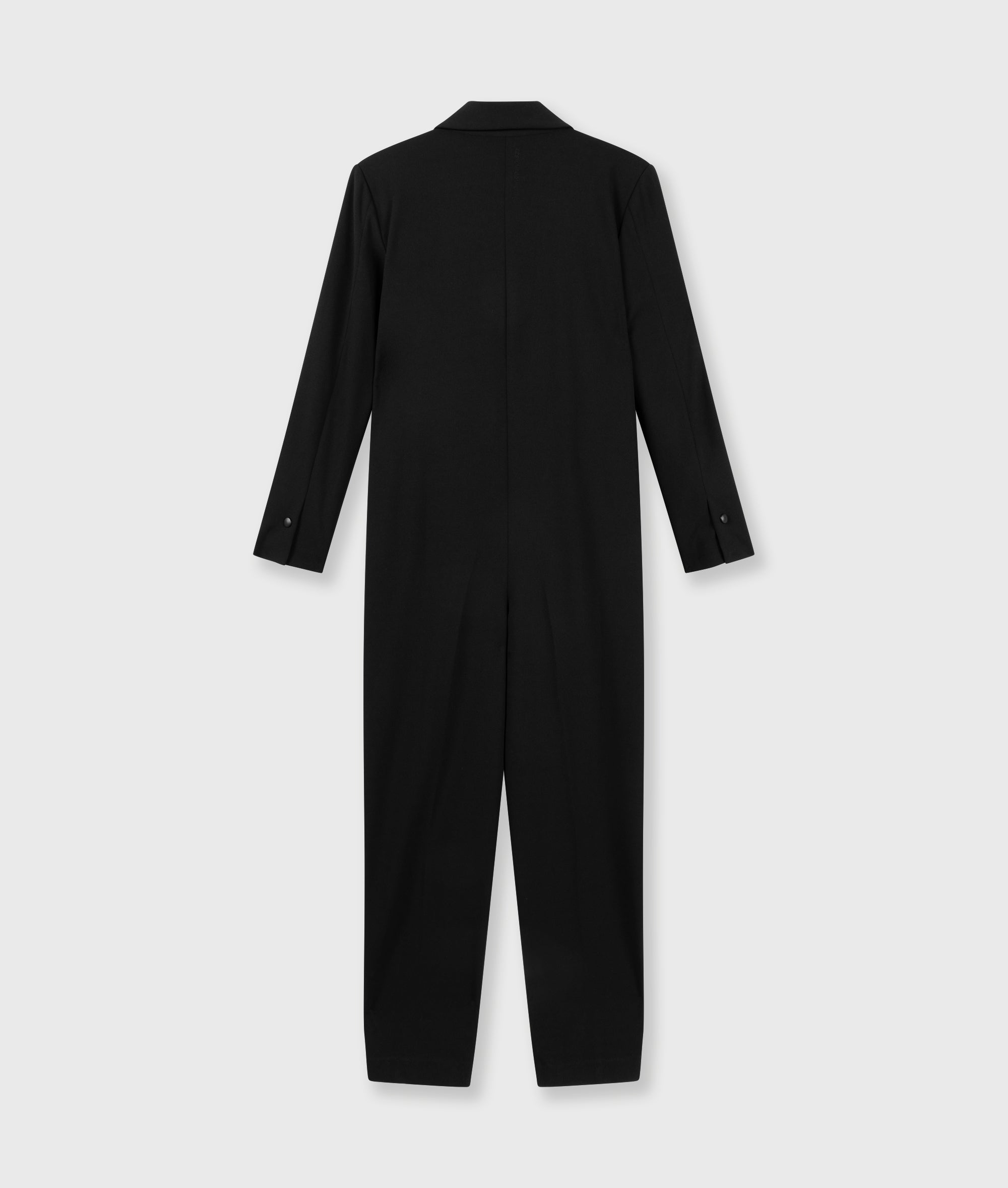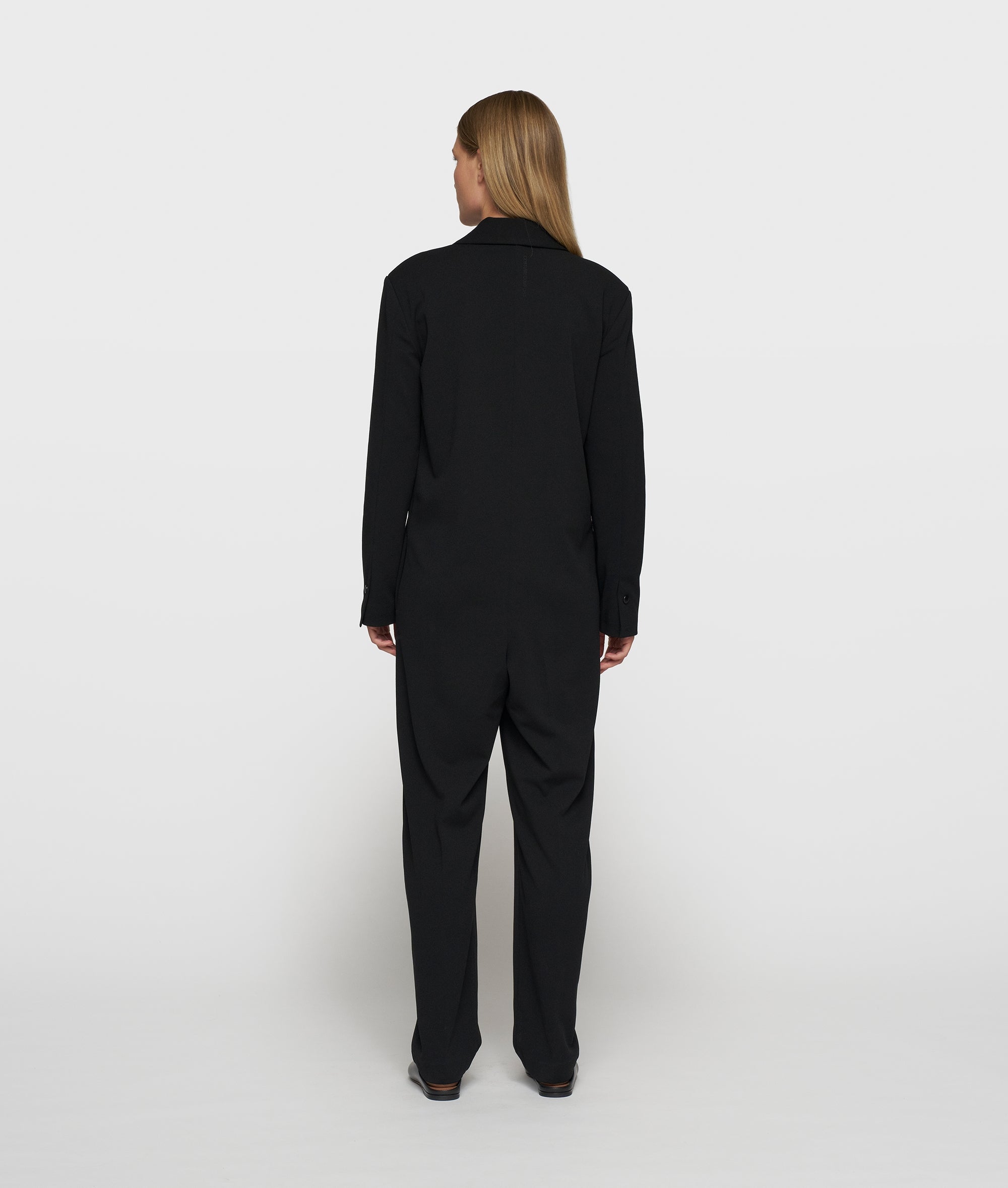 Deze regular fit jumpsuit is gemaakt van lichte zwarte crêpe stretchkwaliteit en voelt comfortabel aan gedurende de hele dag. De klassieke reverskraag, fake paspelzakken en blinde sluiting met matte drukknoopjes zorgen voor een clean en tijdloos ontwerp. De rechte pijpen houden het silhouet ontspannen en gepolijst, terwijl de 'costume comfort' borduring op de rug het signatuur van de 10DAYS925-collectie benadrukt. Ideaal voor werk- en reisdagen.