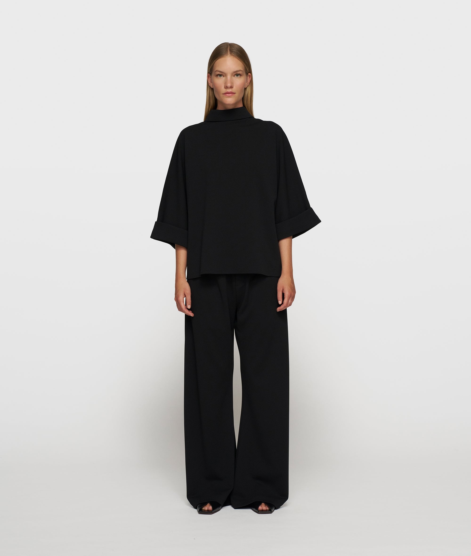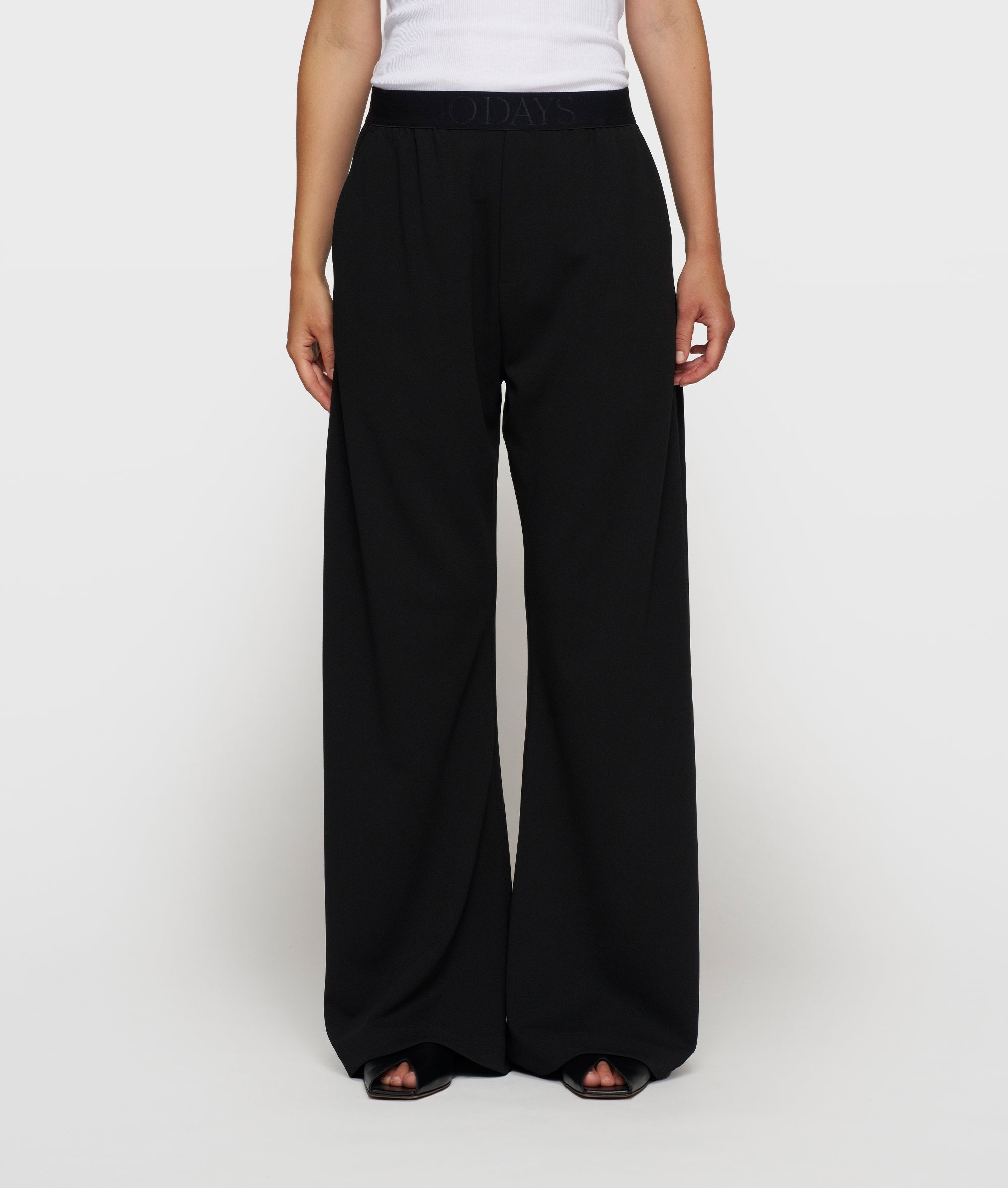 Deze relaxed fit wide leg pantalon is uitgevoerd in lichte zwarte crêpe stretchkwaliteit die soepel meebeweegt en comfortabel aanvoelt. De middelhoge taille en de elastische tailleband, voorzien van een subtiel ‘10DAYS’ logo, zorgen voor een moeiteloze pasvorm. De wide leg pijpen en steekzakken geven een moderne, ontspannen uitstraling, terwijl de neppe gulp zorgt voor een clean silhouet. Ideaal voor werkdagen, reizen en een effortless, professionele look.