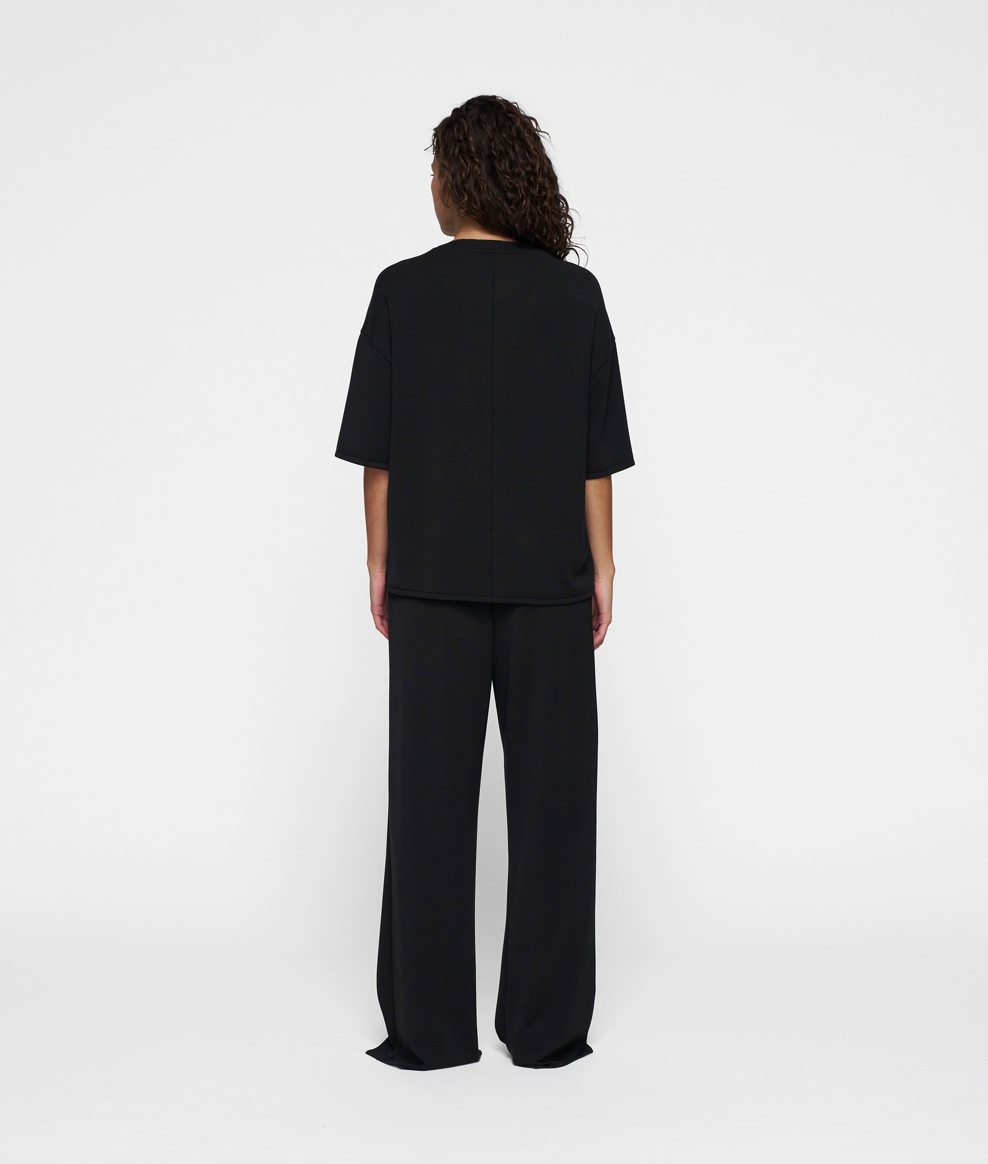 Relaxed fit wide leg broek, gemaakt van superzacht active scuba. Van nature kreukvrij, ultra-zacht en lichtgewicht. Voorzien van een elastische tailleband met trekkoord, steekzakken, een mini stripes logo print onder de linkerzak, kleine splitten onderaan de broekspijpen en een fake paspelzak achter.