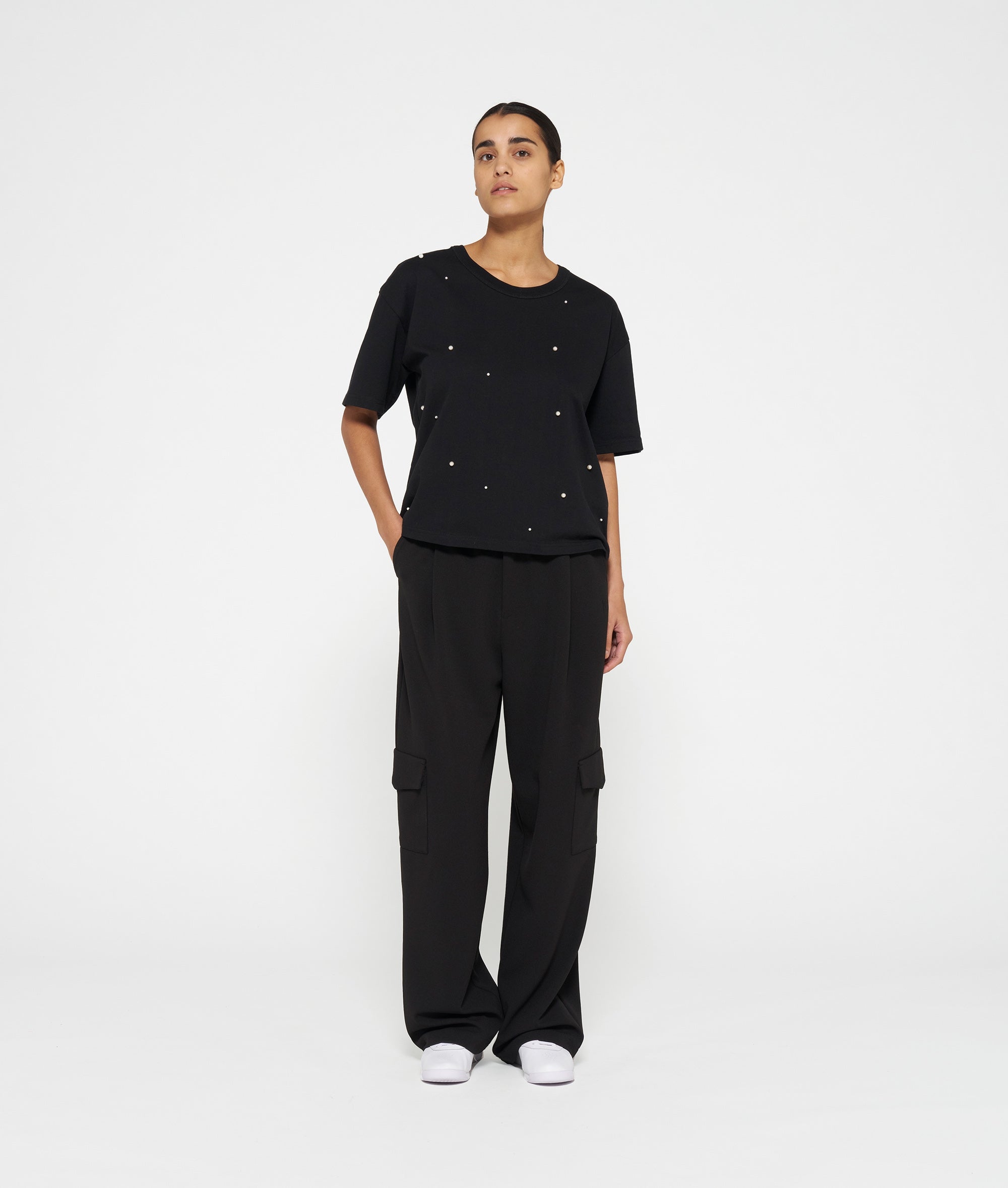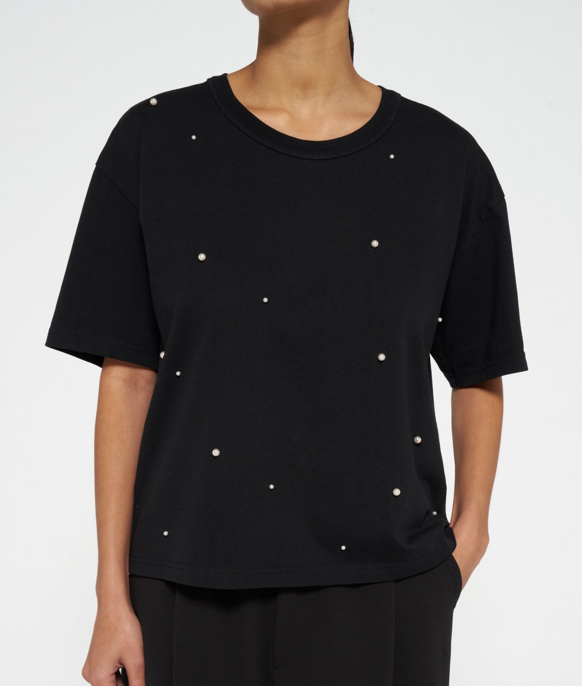 Relaxed fit T-shirt van stevig katoenen jersey met opgestikte parels aan de voorzijde en op de mouwen. Voorzien van een ronde ribgebreide hals, een mini stripes borduring op de rug en een kleine medal label in de linker zijnaad.