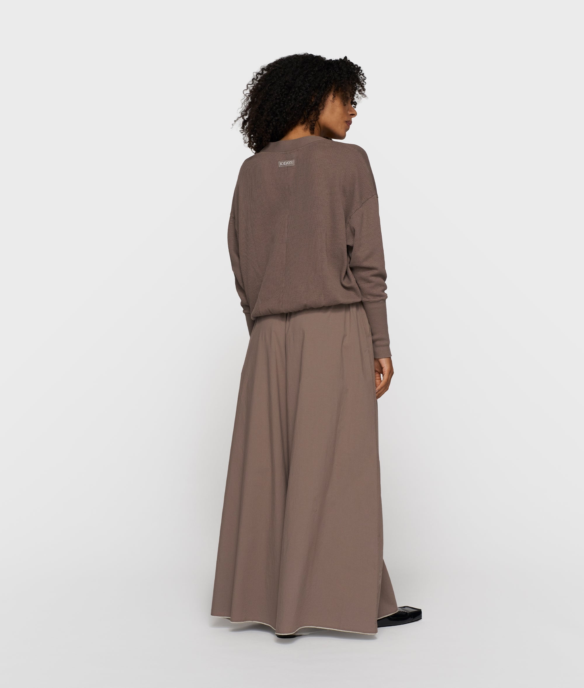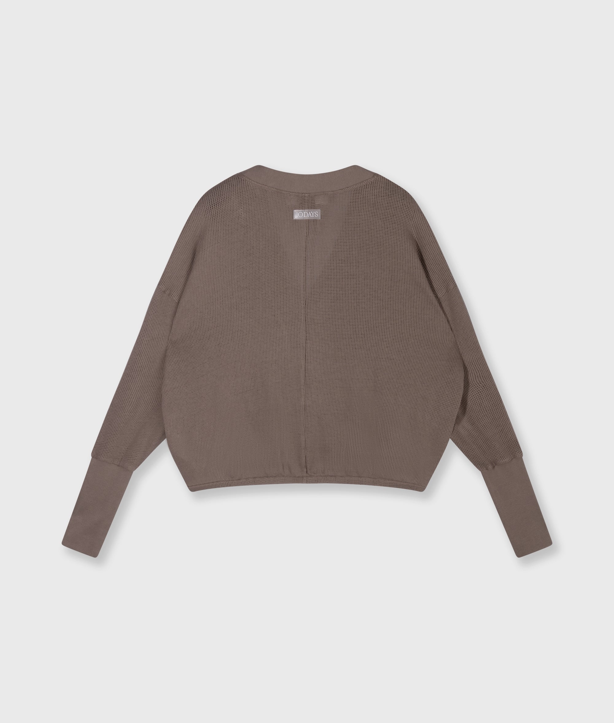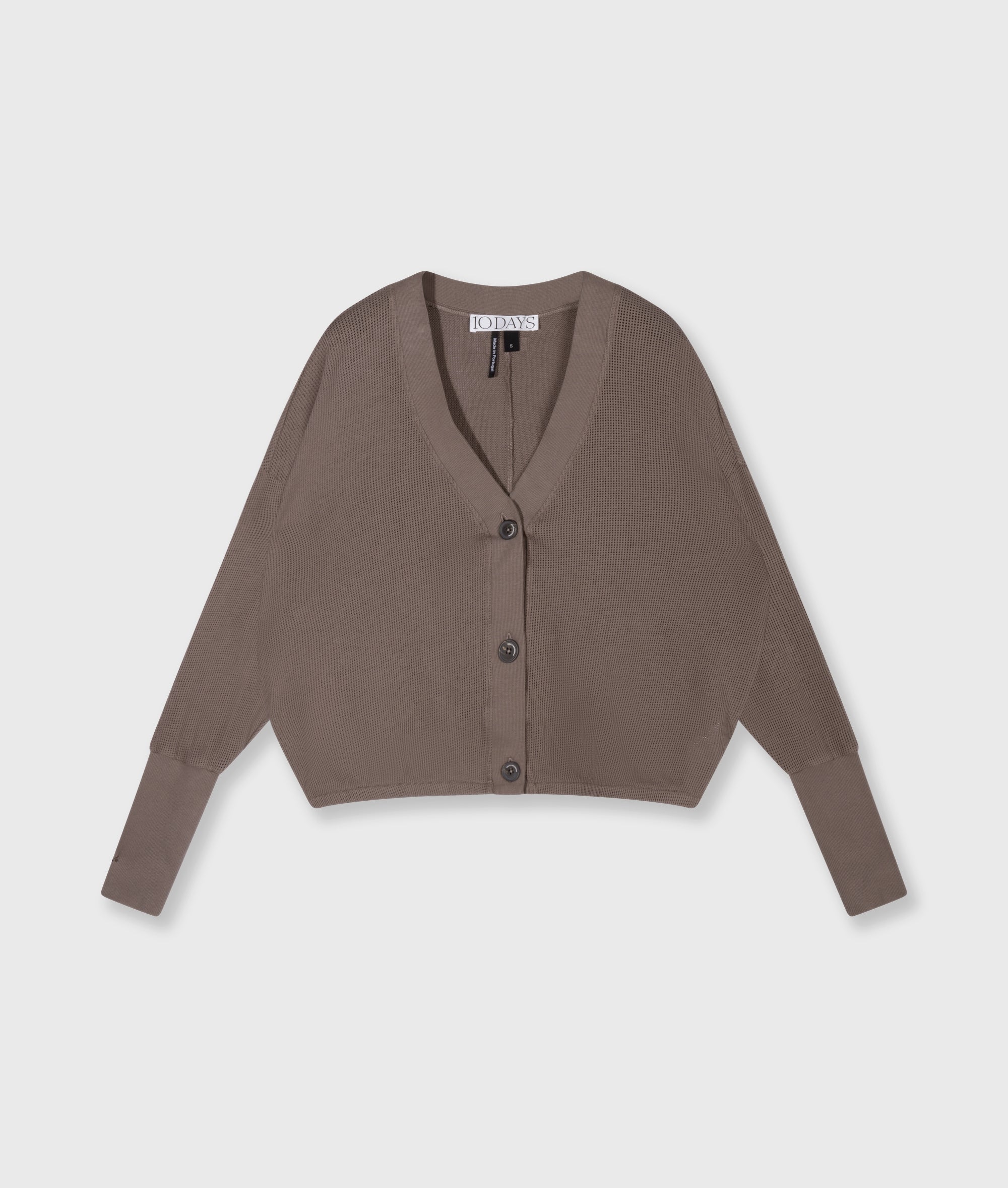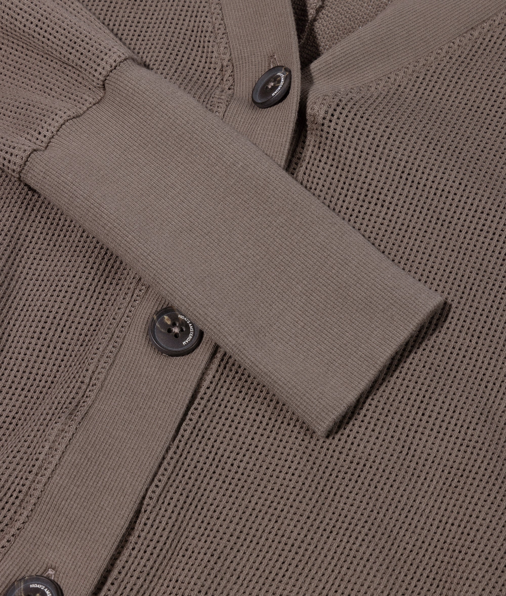 Oversized fit vest, gemaakt van zacht GOTS-gecertificeerd biologisch katoenen mesh. Ontworpen met een diepe V-hals, ribgebreide boorden en een knoopsluiting met drie knopen.