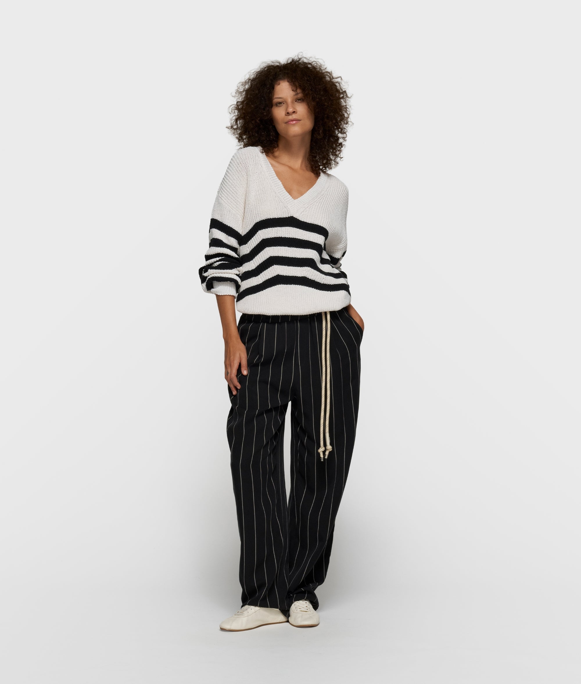 Relaxed fit gebreide sweater met strepen, gemaakt van cotton crêpe knit. Voorzien van een geribde V-hals, manchetten en zoom, een tagline-label aan de mouw en een ‘10’ monogram kraal op de rug.