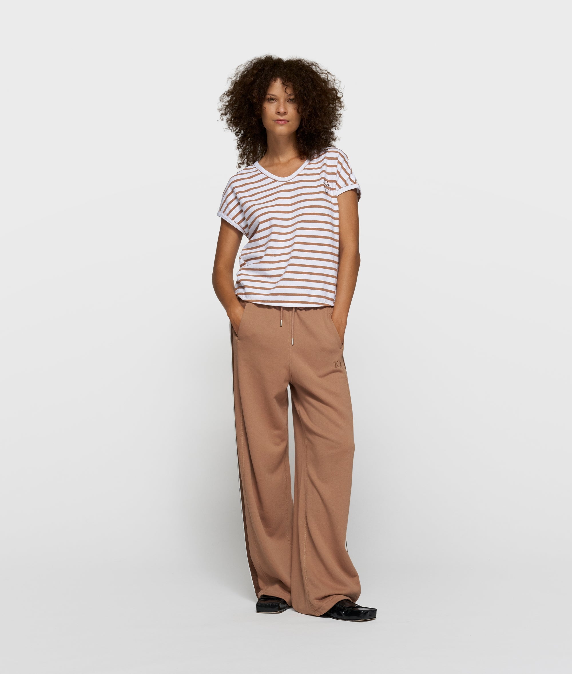 Relaxed fit gestreept shirt, gemaakt van een zacht katoen-linnenblend. Voorzien van een V-hals en een 'curly 10' borduring op de linkerborst.