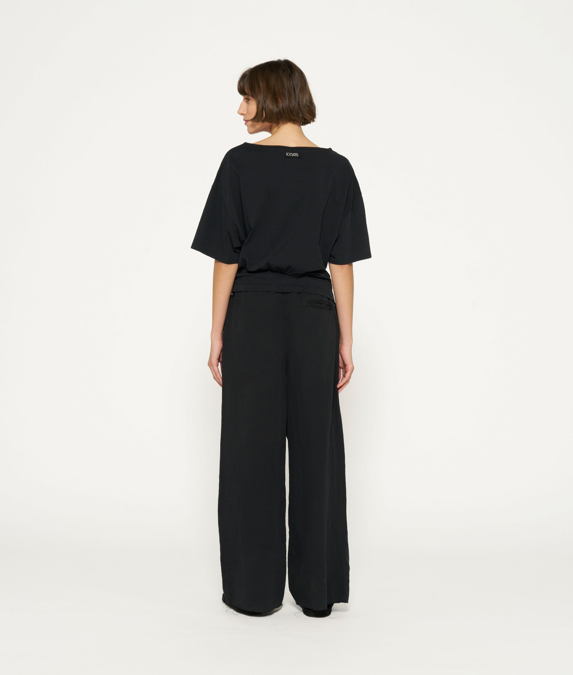 Relaxed fit wijde broek, gemaakt van een katoen en linnen blend slub twill. Voorzien van een elastische jersey tailleband met jersey trekkoord en riemlussen, schuine steekzakken, een label boven de linker steekzak, een medal borduring onder de linker steekzak en een dubbele paspelzak op de achterzijde.
